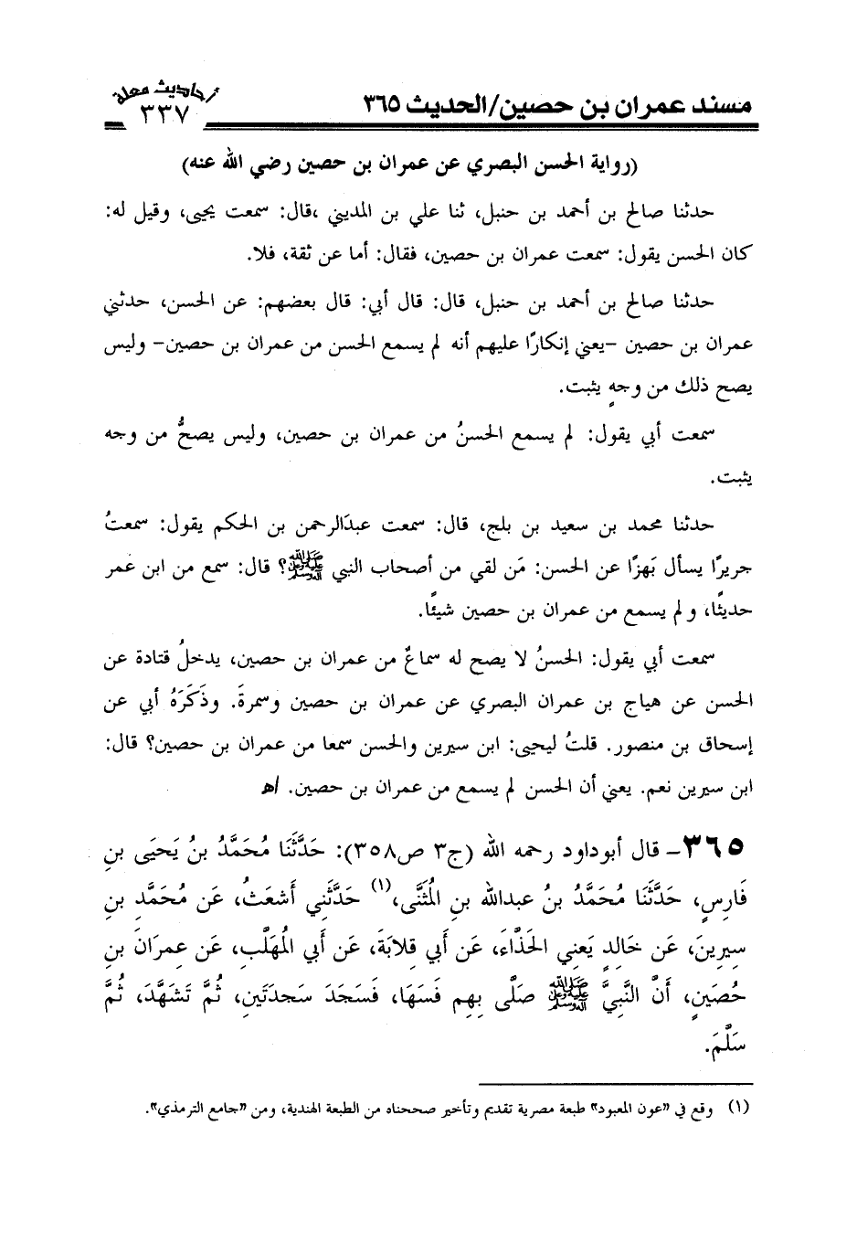 حدثنا صالح بن أحمد بن حنبل قال قال أبي الحسن قال بعضهم حدثني عمران بن حصين يعني إنكاراً عليه أنه لم يسمع من عمران بن حصين.