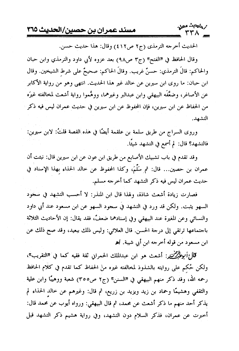 وقال الحافظ في "الفتح (ج3ص98) بعد عزوه لأبي داود والترمذي وابن حبان والحاكم: قال الترمذي حسن غريب وقال الحاكم صحيح على شرط الشيخين وقال بن حبان ما روى بن سيرين عن خالد غير هذا الحديث انتهى وهو من رواية الأكابر عن الاصاغر وضعفه البيهقي وبن عبد البر وغيرهما ووهموا رواية أشعث لمخالفته غيره من الحفاظ عن بن سيرين فإن المحفوظ عن بن سيرين في حديث عمران ليس فيه ذكر التشهد وروى السراج من طريق سلمة بن علقمة أيضا في هذه القصة قلت لابن سيرين فالتشهد قال لم أسمع في التشهد شيئا وقد تقدم في باب تشبيك الأصابع من طريق بن عون عن بن سيرين قال نبئت أن عمران بن حصين قال ثم سلم وكذا المحفوظ عن خالد الحذاء بهذا الإسناد في حديث عمران ليس فيه ذكر التشهد كما أخرجه مسلم فصارت زيادة أشعث شاذة ولهذا قال بن المنذر لا أحسب التشهد في سجود السهو يثبت لكن قد ورد في التشهد في سجود السهو عن بن مسعود عند أبي داود والنسائي وعن المغيرة عند البيهقي وفي اسنادهما ضعف فقد يقال أن الأحاديث الثلاثة في التشهد باجتماعها ترتقي إلى درجة الحسن قال العلائي وليس ذلك ببعيد وقد صح ذلك عن بن مسعود من قوله أخرجه بن أبي شيبة اهـ.