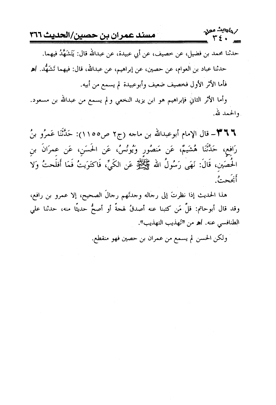 366- قال الإمام أبو عبد الله ابن ماجه رحمه الله (ج2ص1155) : حدثنا عمرو بن رافع. حدثنا هشيم عن منصور ويونس عن الحسن عن عمران ابن الحصين قال نهى رسول الله صَلَّى اللَّهُ عَلَيْهِ وَعَلَىَ آلِهِ وَسَلَّمَ عن الكي. فاكتويت. فما أفلحت ولا أنجحت.) .