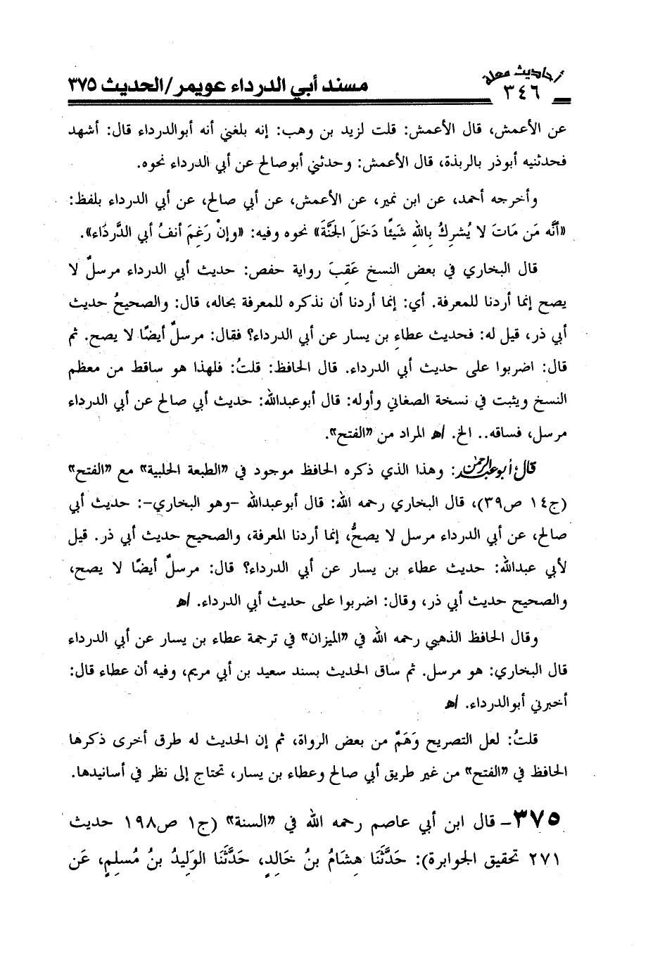 قال أبو عبد الرحمن: وهذا الذي ذكره الحافظ موجود في "الطبعة الحلبية" مع الفتح" (ج14ص39) قال البخاري رحمه الله: قال أبو عبد الله - يعني البخاري- حديث أبي صالح عن أبي الدرداء مرسل لا يصح، إنما أردنا المعرفة، والصحيح حديث أبي ذر قيل لأبي عبد الله: حديث عطاء بن يسار عن أبي الدرداء؟ قال مرسل أيضاً لا يصح والصحيح حديث أبي الدرداء ثم قال اضربوا على حديث أبي الدرداء. اهـ