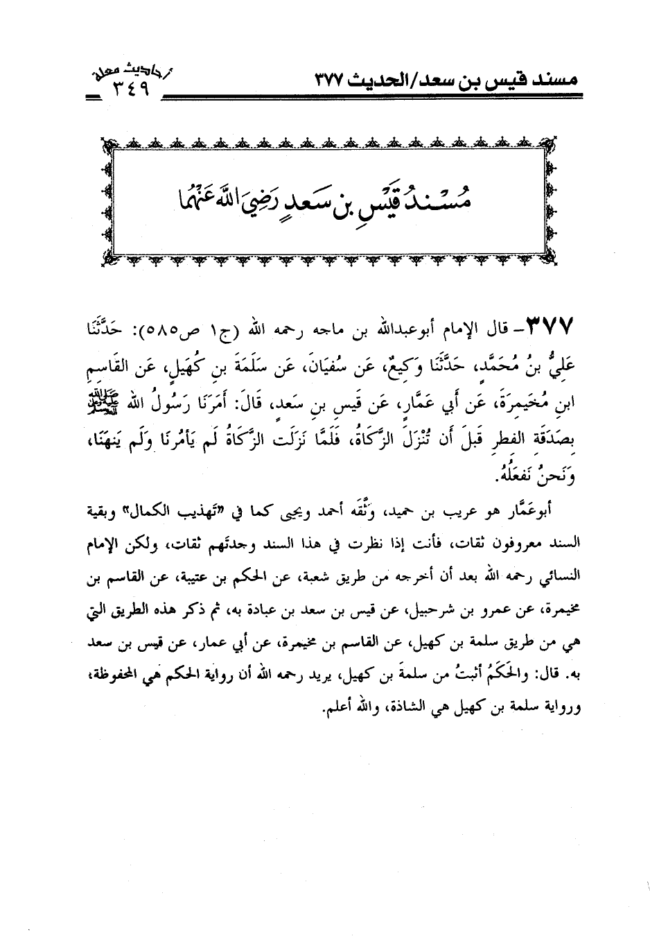 377- قال الإمام أبو عبد الله ابن ماجه رحمه الله (ج1ص585) : حدثنا علي بن محمد حدثنا وكيع عن سفيان عن سلمة بن كهيل عن القاسم بن مخيمرة عن أبي عمار عن قيس بن سعد قال: أمرنا رسول الله صَلَّى اللَّهُ عَلَيْهِ وَعَلَىَ آلِهِ وَسَلَّمَ بصدقة الفطر قبل أن تنزل الزكاة فلما نزلت الزكاة لم يأمرنا ولم ينهنا ونحن نفعله) .