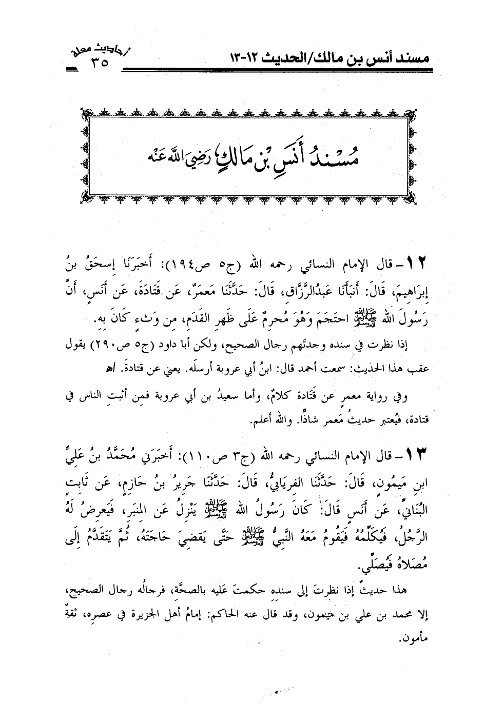 12-قال الإمام النسائي رحمه الله (ج5ص194) : أَخْبَرَنَا إِسْحَقُ بْنُ إِبْرَاهِيمَ قَالَ أَنْبَأَنَا عَبْدُ الرَّزَّاقِ قَالَ حَدَّثَنَا مَعْمَرٌ عَنْ قَتَادَةَ عَنْ أَنَسٍ أَنَّ رَسُولَ اللَّهِ صَلَّى اللَّهُ عَلَيْهِ وَعَلَى آلِهِ وَسَلَّمَ احْتَجَمَ وَهُوَ مُحْرِمٌ عَلَى ظَهْرِ الْقَدَمِ مِنْ وَثْءٍ كَانَ بِهِ.