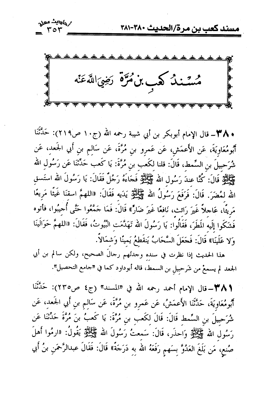 380- قال الإمام أبو بكر بن أبي شيبة رحمه الله (ج10ص219) : حَدَّثَنَا أَبُو مُعَاوِيَةَ، عَنِ الأَعْمَشِ، عَنْ عَمْرِو بْنِ مُرَّةَ، عَن سَالِمِ بْنِ أَبِي الْجَعْدِ، عَن شُرَحْبِيلَ بْنِ السَّمْطِ قَالَ: قلْنَا لِكَعْبِ بْنِ مُرَّةَ يَا كَعْبُ، حَدِّثْنَا، عَن رَسُولِ اللهِ صَلَّى اللَّهُ عَلَيْهِ وَعَلَىَ آلِهِ وَسَلَّمَ فقَالَ: كُنَّا عِنْدَ رَسُولِ اللهِ صَلَّى اللَّهُ عَلَيْهِ وَعَلَىَ آلِهِ وَسَلَّمَ وَجَاءَهُ رَجُلٌ فَقَالَ: يَا رَسُولَ اللهِ، اسْتَسْقِ اللَّهَ لِمُضَرَ، قَالَ: فَرَفَعَ رَسُولُ اللهِ صَلَّى اللَّهُ عَلَيْهِ وَعَلَىَ آلِهِ وَسَلَّمَ يَدَيْهِ فَقَالَ: اللَّهُمَّ اسْقِنَا غَيْثًا مَرِيعًا مَرِيًّا عَاجِلاً غَيْرَ رَائِثٍ نَافِعًا غَيْرَ ضَارٍّ، قَالَ: فَمَا جَمَّعُوا حَتَّى أُحيوا فَأَتَوْهُ فَشَكَوْا إلَيْهِ الْمَطَرَ، فَقَالُوا: يَا رَسُولَ اللهِ، تَهَدَّمَتِ الْبُيُوتُ فَقَالَ رَسُولُ اللهِ صَلَّى اللَّهُ عَلَيْهِ وَعَلَىَ آلِهِ وَسَلَّمَ بِيَدِهِ: اللَّهُمَّ حَوَالَيْنَا، وَلا عَلَيْنَا، قَالَ: فَجَعَلَ السَّحَابُ يَتَقَطَّعُ يَمِينًا وَشِمَالاً) .