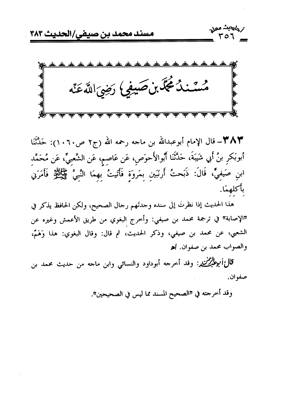 383- قال الإمام أبو عبد الله ابن ماجه رحمه الله (ج2ص1060) : حدثنا أبو بكر بن أبي شيبة. حدثنا أبو الأحوص عن عاصم عن الشعبي عن محمد بن صيفي قال: ذبحت أرنبين بمروة. فأتيت بهما النبي صَلَّى اللَّهُ عَلَيْهِ وَعَلَىَ آلِهِ وَسَلَّمَ. فأمرني بأكلهما.