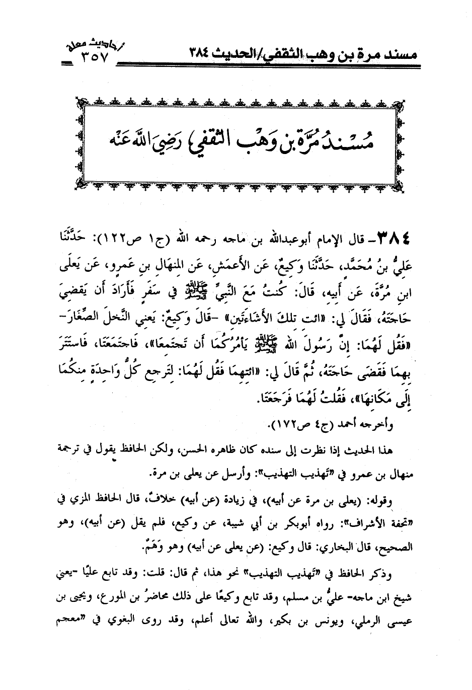 384- قال الإمام أبو عبد الله ابن ماجه رحمه الله (ج1ص122) : دثنا علي بن محمد. حدثنا وكيع عن الأعمش عن المنهال بن عمرو عن يعلى بن مرة عن أبيه قال: كنت مع النبي صَلَّى اللَّهُ عَلَيْهِ وَعَلَىَ آلِهِ وَسَلَّمَ في سفر. فأراد أن يقضي حاجته. فقال لي (ائت تلك الأشاءتين) قال وكيع يعني النخل الصغار. (فقل لها أن رسول الله صَلَّى اللَّهُ عَلَيْهِ وَعَلَىَ آلِهِ وَسَلَّمَ يأمركما أن تجتمعا) . فاجتمعتا. فاستتر بهما. فقضى حاجته ثم قال لي (ائتهما فقل لهما لترجع كل واحدة منكما إلى مكانها) فقلت لهما. فرجعتا