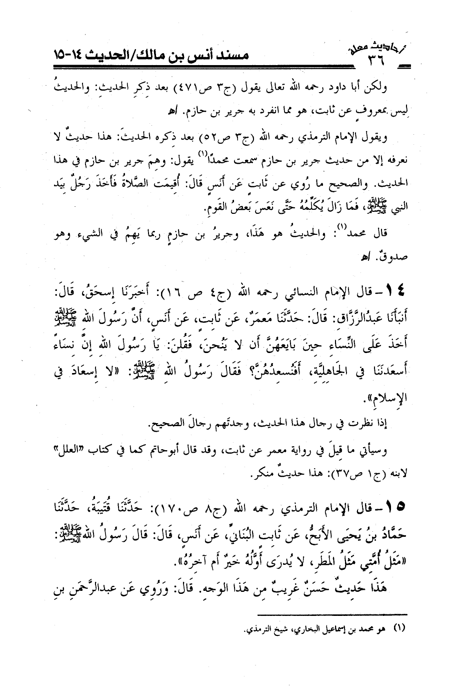 ويقول الإمام الترمذي رحمه الله (ج3ص52) بعد ذكره الحديث هذا حديث لا نعرفه إلا من حديث جرير بن حازم سمعت يقول: وهم جرير بن حازم في هذا الحديث. والصحيح ما روي عن ثابت عن أنس قال: أقيمت الصلاة فأخذ رجل بيد النبي - صلى الله عليه وعلى آله وسلم - فمازال يكلمه حتى نعس بعض القوم.