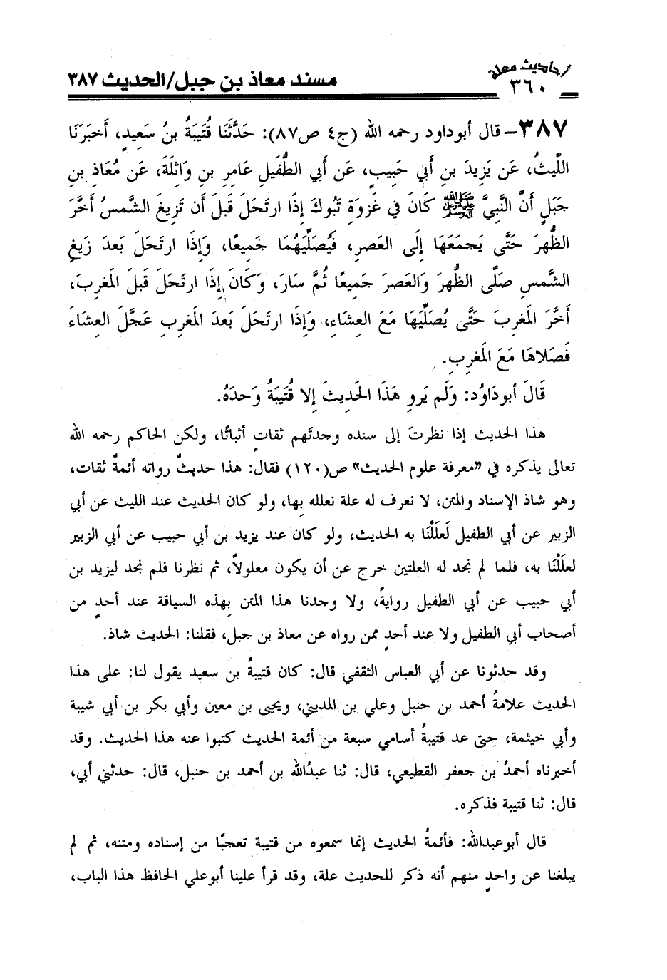 387- قال الإمام أبو داود رحمه الله (ج4ص87) حدثنا قُتَيْبَةُ بنُ سَعِيدٍ أخبرنا اللَّيْثُ عن يَزِيدَ بنِ أبي حَبِيبٍ عن أبي الطُّفَيْلِ عَامِرِ بنِ وَاثلَةَ عن مُعَاذِ بنِ جَبَلٍ: "أَنَّ النَّبيَّ صَلَّى اللَّهُ عَلَيْهِ وَعَلَىَ آلِهِ وَسَلَّمَ كَان في غَزْوَةِ تَبُوك إذا ارْتَحَلَ قَبْلَ أَنْ تَزِيغَ الشَّمْسُ أَخَّرَ الظُّهْرَ حتى يَجْمَعَهَا إِلى الْعَصْرِ فَيُصَلِّيِهمَا جَمِيعاً، وَإذا ارْتَحَلَ بَعْدَ زَيْغِ الشَّمسِ صَلَّى الظُّهْرَ وَالْعَصْرَ جَمِيعاً ثُمَّ سَارَ، وكَان إذا ارْتَحَلَ قَبْلَ المَغْرِبِ أَخَّرَ المَغْرِبَ حتى يُصَلِّيَهَا مع الْعِشَاءِ، وإذا ارْتَحَلَ بَعْدَ المَغْرِبِ عَجَّلَ الْعِشَاءَ فَصَلاَّهَا مع المَغْرِبِ".