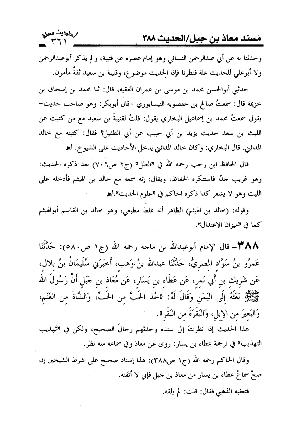 388- قال الإمام أبو عبد الله ابن ماجه رحمه الله (ج1ص580) : حدثنا عمرو بن سواد المصري، حدثنا عبد الله بن وهب، أخبرني سليمان بن بلال عن شريك بن أبي نمر عن عطاء بن يسار عن معاذ بن جبل: أن رسول الله صَلَّى اللَّهُ عَلَيْهِ وَعَلَىَ آلِهِ وَسَلَّمَ بعثه إلى اليمن وقال له (خذ الحب من الحب. والشاة من الغنم. والبعير من الإبل. والبقرة من البقر) .
