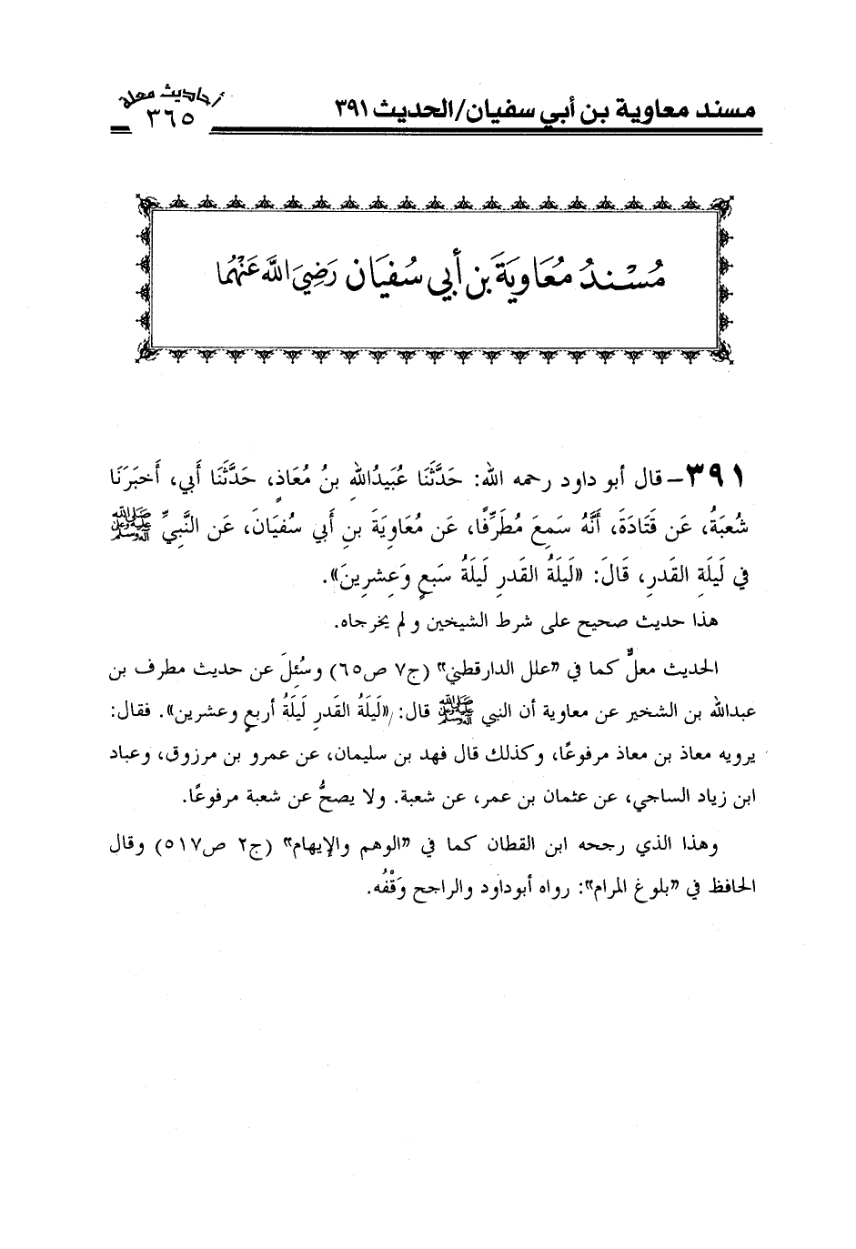 391- قال الإمام أبو داود رحمه الله حدثنا عُبَيْدُ الله بنُ مُعَاذٍ أخبرنا أبِي أخبرنا شُعْبَةُ عن قَتَادَةَ أَنَّهُ سَمِعَ مُطَرِّفاً عن مُعَاوِيَةَ بنِ أبي سُفْيَانَ عن النَّبيِّ صَلَّى اللَّهُ عَلَيْهِ وعلى آله وَسَلَّمَ في لَيْلَةِ الْقَدْرِ قال: "لَيْلَةُ الْقَدْرِ لَيْلَةُ سَبْعٍ وَعِشْرِينَ".
