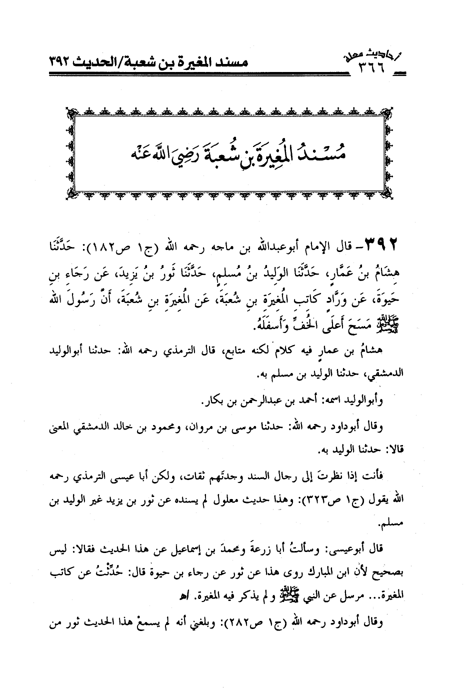 392- قال الإمام أبو عبد الله ابن ماجه رحمه الله (ج1ص182) : حدثنا هشام بن عمار، حدثنا الوليد بن مسلم، حدثنا ثور بن يزيد عن رجاء بن حيوة عن وراد كاتب المغيرة بن شعبة عن المغيرة بن شعبة: - أن رسول الله صَلَّى اللَّهُ عَلَيْهِ وَعَلَىَ آلِهِ وَسَلَّمَ مسح أعلى الخف وأسفله