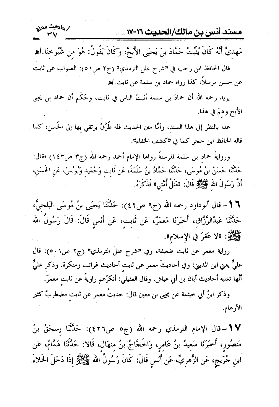 16- قال أبو داود رحمه الله (ج9ص42) : حَدَّثَنَا يَحْيَى بْنُ مُوسَى الْبَلْخِيُّ، حَدَّثَنَا عَبْدُ الرَّزَّاقِ، أَخْبَرَنَا مَعْمَرٌ، عَنْ ثَابِتٍ عَنْ أَنَسٍ قَالَ: قَالَ: رَسُولُ اللَّهِ صَلَّى اللَّهُ عَلَيْهِ وَعَلَى آلِهِ وَسَلَّمَ "لَا عَقْرَ فِي الْإِسْلَامِ ".