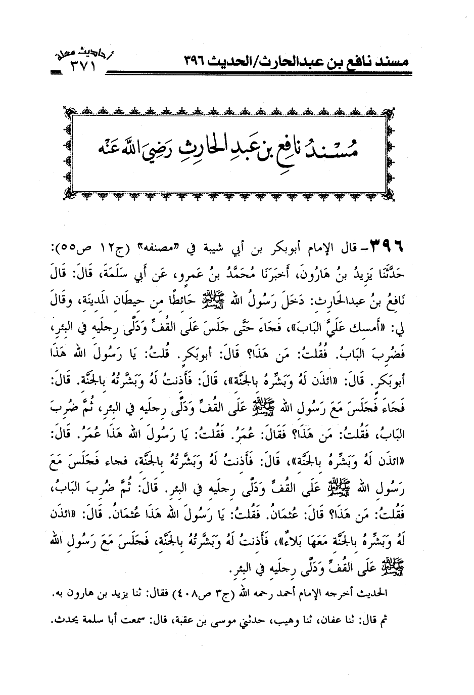 396- قال الإمام أبو بكر بن أبي شيبة في "مصنفه" (ج12ص55) حَدَّثَنَا يَزِيدُ بْنُ هَارُونَ , قَالَ: أَخْبَرَنَا مُحَمَّدُ بْنُ عَمْرٍو , عَنْ أَبِي سَلَمَةَ , قَالَ: قَالَ نَافِعُ بْنُ عَبْدِ الْحَارِثِ: دَخَلَ رَسُولُ اللهِ صَلَّى اللَّهُ عَلَيْهِ وَعَلَىَ آلِهِ وَسَلَّمَ حَائِطًا مِنْ حِيطَانِ الْمَدِينَةِ , وَقَالَ لِي: أَمْسِكْ عَلَي الْبَاب , فَجَاءَ حَتَّى جَلَسَ عَلَى الْقُفِّ وَدَلَّى رِجْلَيْهِ فِي الْبِئْرِ فَضُرِبَ الْبَابُ , فَقُلْتُ: مَنْ هَذَا؟ قَالَ: أَبُو بَكْرٍ , قُلْتُ: يَا رَسُولَ اللهِ هَذَا أَبُو بَكْرٍ , فَقَالَ: ائْذَنْ لَهُ وَبَشِّرْهُ بِالْجَنَّةِ , قَالَ: فَأَذِنْت لَهُ وَبَشَّرْتُهُ بِالْجَنَّةِ , فَجَاءَ فَجَلَسَ مَعَ رَسُولِ اللهِ صَلَّى اللَّهُ عَلَيْهِ وَعَلَىَ آلِهِ وَسَلَّمَ عَلَى الْقُفِّ وَدَلَّى رِجْلَيْهِ فِي الْبِئْرِ , ثُمَّ ضُرِبَ الْبَابُ , فَقُلْتُ: مَنْ هَذَا , قَالَ: عُمَرُ , قُلْتُ: يَا رَسُولَ اللهِ هَذَا عُمَرُ , فَقَالَ: ائْذَنْ لَهُ وَبَشِّرْهُ بِالْجَنَّةِ , قَالَ: فَأَذِنْت لَهُ وَبَشَّرْتُهُ بِالْجَنَّةِ فَجَاءَ فَجَلَسَ مَعَ رَسُولِ اللهِ صَلَّى اللَّهُ عَلَيْهِ وَعَلَىَ آلِهِ وَسَلَّمَ عَلَى الْقُفِّ وَدَلَّى رِجْلَيْهِ فِي الْبِئْرِ , ثُمَّ ضُرِبَ الْبَابُ فَقُلْتُ: مَنْ هَذَا , قَالَ: عُثْمَان , قُلْتُ: يَا رَسُولَ اللهِ هَذَا عُثْمَان , قَالَ: ائْذَنْ لَهُ وَبَشِّرْهُ بِالْجَنَّةِ مَعَ بَلاَءٍ , قَالَ: فَأَذِنْتُ لَهُ وَبَشَّرْتُهُ بِالْجَنَّةِ فَدَخَلَ فَجَلَسَ مَعَ رَسُولِ اللهِ صَلَّى اللَّهُ عَلَيْهِ وَعَلَىَ آلِهِ وَسَلَّمَ عَلَى الْقُفِّ وَدَلَّى رِجْلَيْهِ فِي الْبِئْرِ) .