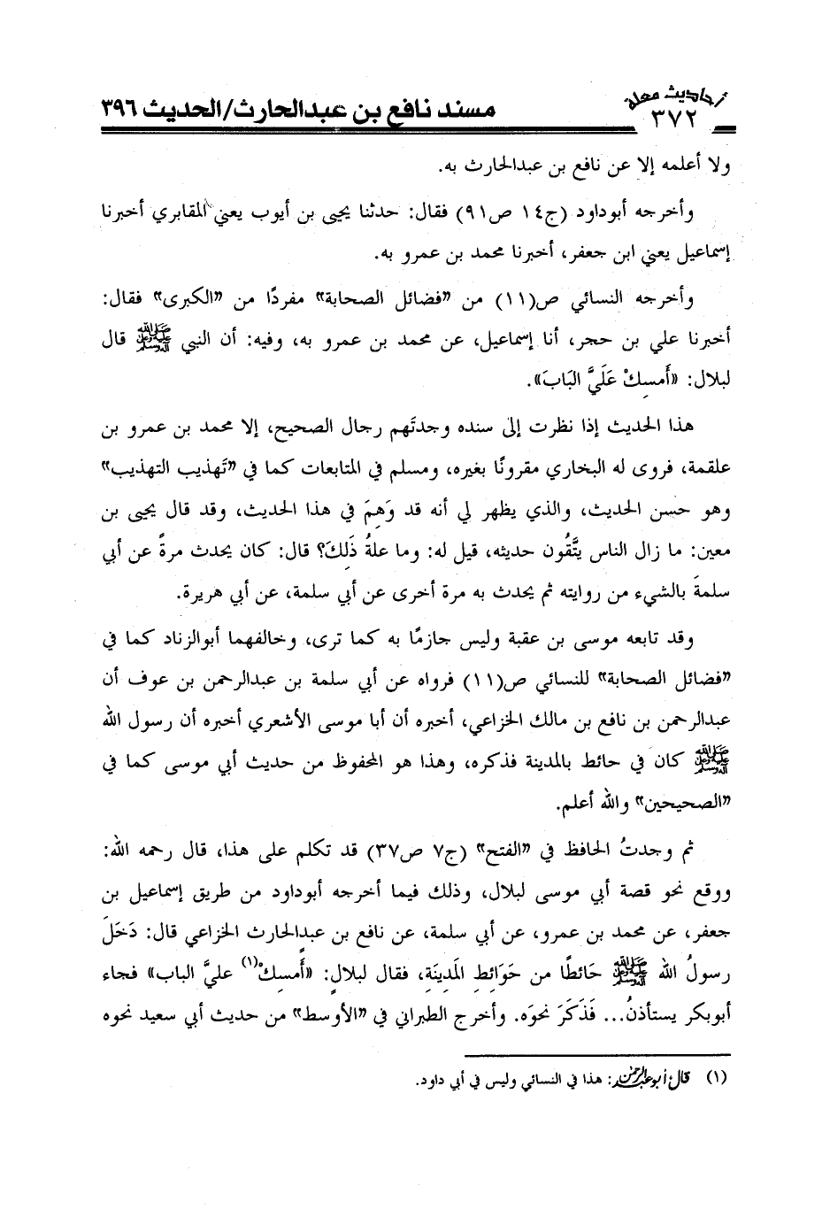 وأخرجه النسائي ص (11) من "فضائل الصحابة" مفرداً من "الكبرى" فقال أخبرنا علي بن حجر قال أنا إسماعيل عن محمد بن عمرو عن أبي سلمة عن نافع بن عبد الحارث الخزاعي قال دخل رسول الله صَلَّى اللَّهُ عَلَيْهِ وَعَلَىَ آلِهِ وَسَلَّمَ حائطا من حوائط المدينة فقال لبلال أمسك علي الباب.