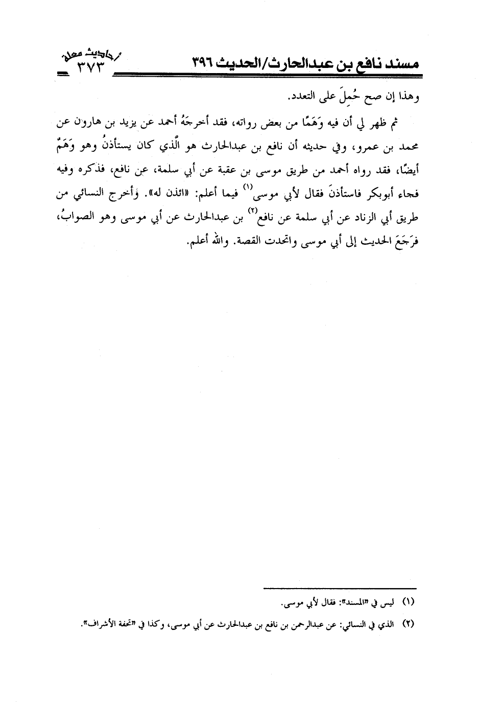 ثم ظهر لي أن فيه وهما من بعض رواته فقد أخرجه احمد عن يزيد بن هارون عن محمد بن عمرو وفي حديثه أن نافع بن عبد الحارث هو الذي كان يستأذن وهو وهم أيضاً فقد رواه احمد من طريق موسى بن عقبة عن أبي سلمة عن نافع فذكره وفيه فجاء أبو بكر فاستأذن فقال لأبي موسى (1) فيما أعلم ائذن له وأخرجه النسائي من طريق أبي الزناد عن أبي سلمة عن نافع (2) بن عبد الحارث عن أبي موسى وهو الصواب فرجع الحديث إلى أبي موسى واتحدت القصة والله اعلم.
