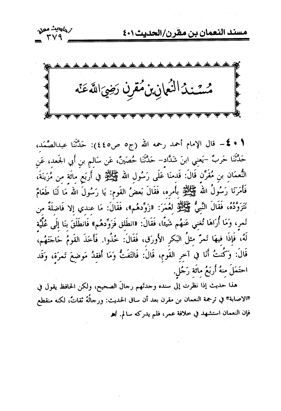 401- قال الإمام أحمد رحمه الله (ج5ص445) : حَدَّثَنَا عَبْدُ الصَّمَدِ حَدَّثَنَا حَرْبٌ يَعْنِي ابْنَ شَدَّادٍ حَدَّثَنَا حُصَيْنٌ عَنْ سَالِمِ بْنِ أَبِي الْجَعْدِ عَنِ النُّعْمَانِ بْنِ مُقَرِّنٍ قَالَ قَدِمْنَا عَلَى رَسُولِ اللَّهِ صَلَّى اللَّهُ عَلَيْهِ وَعَلَىَ آلِهِ وَسَلَّمَ فِي أَرْبَعِ مِائَةٍ مِنْ مُزَيْنَةَ فَأَمَرَنَا رَسُولُ اللَّهِ صَلَّى اللَّهُ عَلَيْهِ وَعَلَىَ آلِهِ وَسَلَّمَبِأَمْرِهِ فَقَالَ بَعْضُ الْقَوْمِ يَا رَسُولَ اللَّهِ مَا لَنَا طَعَامٌ نَتَزَوَّدُهُ فَقَالَ النَّبِيُّ صَلَّى اللَّهُ عَلَيْهِ وَعَلَىَ آلِهِ وَسَلَّمَ لِعُمَرَ زَوِّدْهُمْ فَقَالَ مَا عِنْدِي إِلَّا فَاضِلَةٌ مِنْ تَمْرٍ وَمَا أُرَاهَا تُغْنِي عَنْهُمْ شَيْئًا فَقَالَ انْطَلِقْ فَزَوِّدْهُمْ فَانْطَلَقَ بِنَا إِلَى عُلِّيَّةٍ لَهُ فَإِذَا فِيهَا تَمْرٌ مِثْلُ الْبَكْرِ الْأَوْرَقِ فَقَالَ خُذُوا فَأَخَذَ الْقَوْمُ حَاجَتَهُمْ قَالَ وَكُنْتُ أَنَا فِي آخِرِ الْقَوْمِ قَالَ فَالْتَفَتُّ وَمَا أَفْقِدُ مَوْضِعَ تَمْرَةٍ وَقَدْ احْتَمَلَ مِنْهُ أَرْبَعُ مِائَةِ رَجُلٍ) .