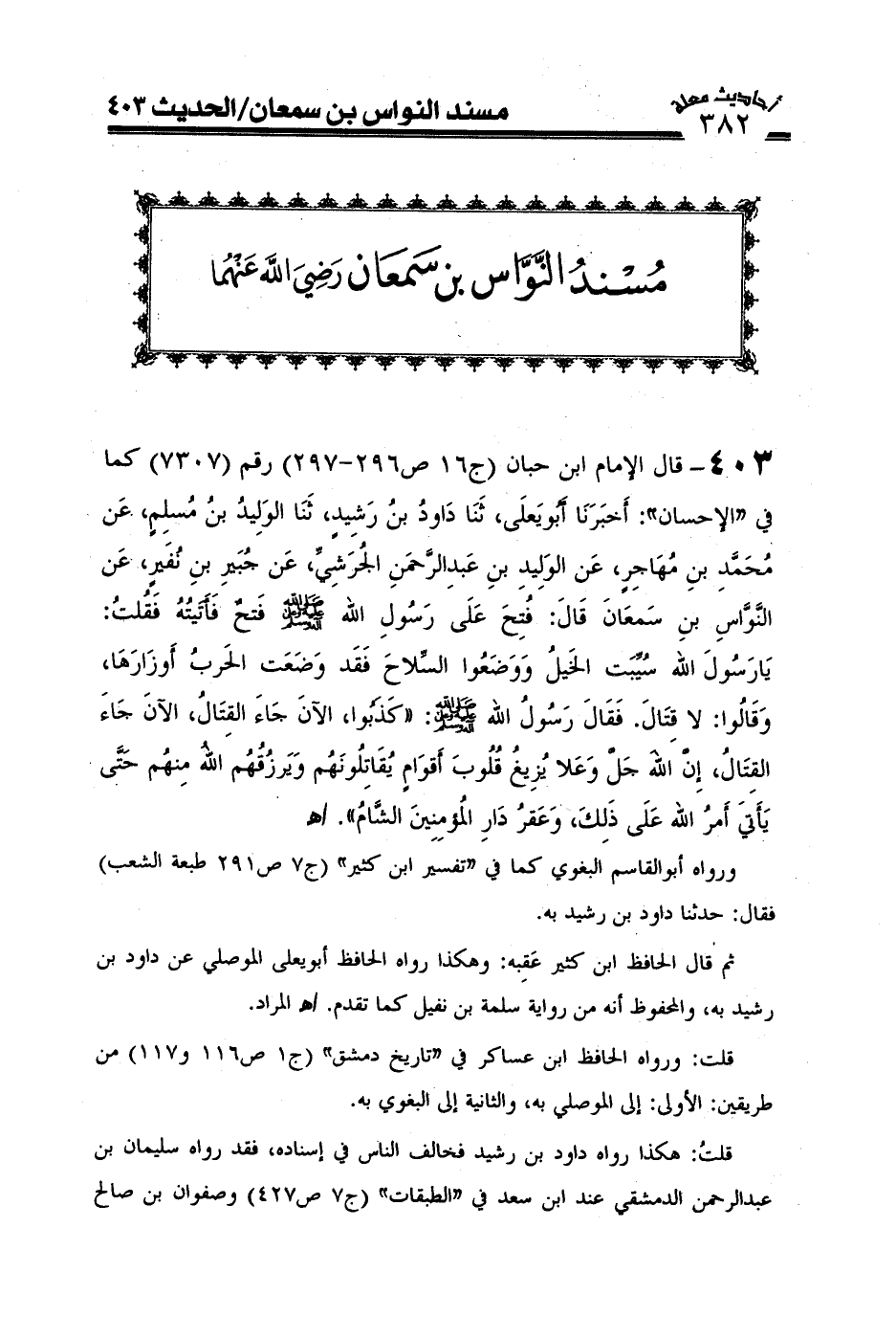 403- قال الإمام ابن حبان رحمه الله في (ج16ص296-297) رقم (7307) كما في "الحسان": أخبرنا أبو يعلى حدثنا داود بن رشيد حدثنا الوليد بن مسلم عن محمد بن مهاجر عن الوليد بن عبد الرحمن الجرشي عن جبير بن نفير عن النواس بن سمعان قال: فتح على رسول الله صَلَّى اللَّهُ عَلَيْهِ وَعَلَىَ آلِهِ وَسَلَّمَ فتح فأتيته فقلت: يا رسول الله سيب الخيل ووضعوا السلاح فقد وضعت الحرب أوزارها وقالوا: لا قتال فقال رسول الله صَلَّى اللَّهُ عَلَيْهِ وَعَلَىَ آلِهِ وَسَلَّمَ: (كذبوا الآن جاء القتال الآن جاء القتال إن الله جل وعلا يزيغ قلوب أقوام يقاتلون ويرزقهم الله منهم حتىى يأتي أمر الله على ذلك وعقر دار المؤمنين الشام)