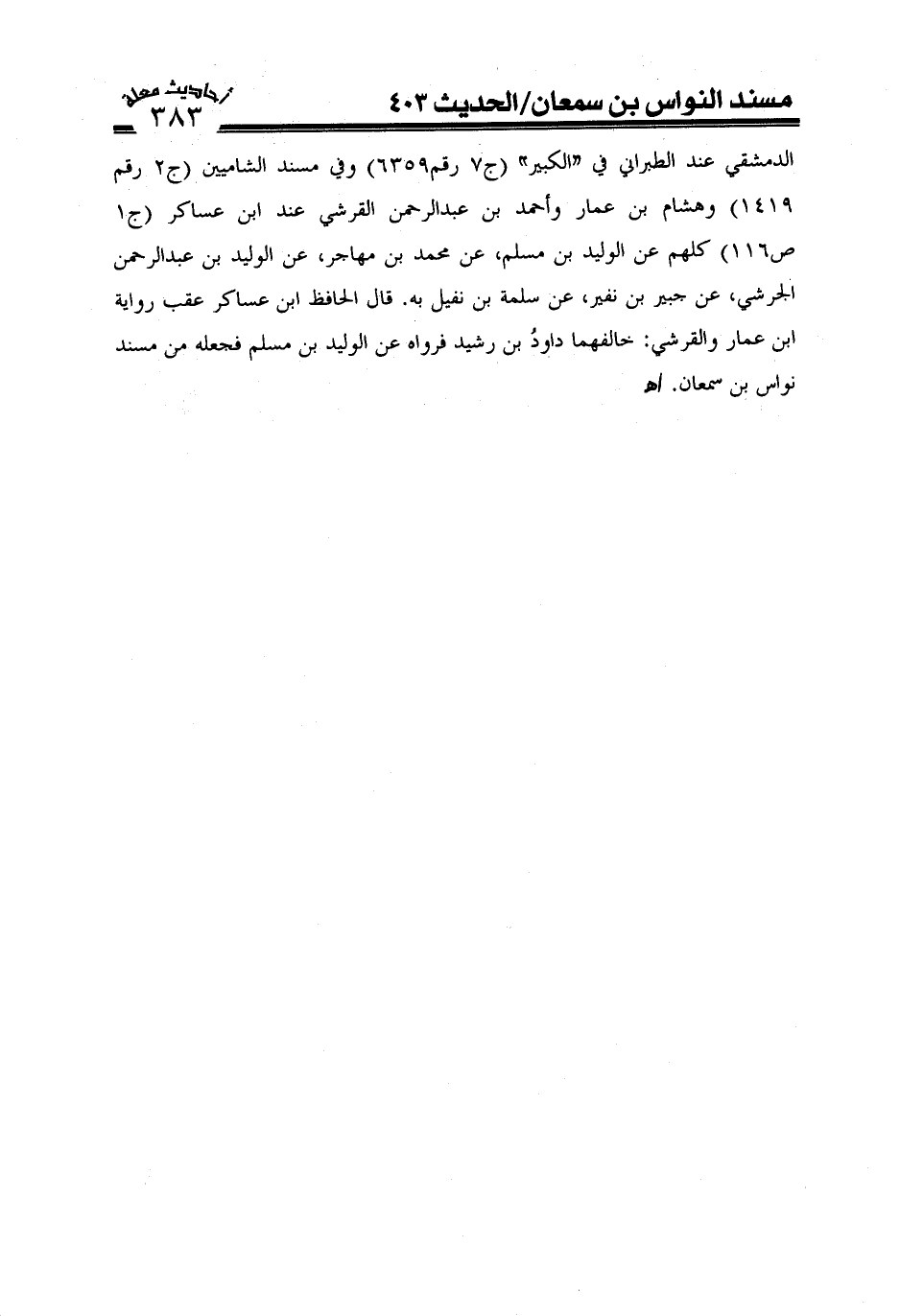 الدمشقي عند الطبراني في الكبير (ج7 رقم 6359) وفي مسند الشاميين (ج2 رقم 1419) وهشام بن عمار وأحمد بن عبد الرحمن القرشي عند ابن عساكر (ج1ص116) كلهم عن الوليد بن مسلم، عن محمد بن مهاجر، عن الوليد بن عبد الرحمن الجرشي، عن جبير بن بفير، عن سلمة بن نفي لبه. قال الحافظ بن عساكر عقب رواية ابن عمار والقرشي: خالفهما داود بن رشيد فرواه عن الوليد بن مسلم فجعله من مسند نواس بن سمعان. اهـ