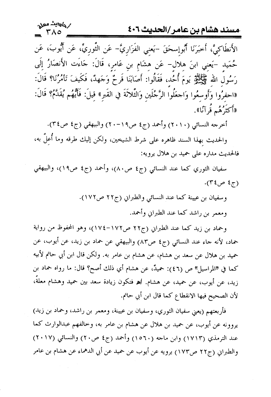 وحمادبن زيد كما عند الطبراني (ج22ص172) ، وهوالمحفوظ من رواية حماد، لانه جاء عند النسائي (ج4ص83) والبيهقي عن حماد بن زيد، عن ابو، عن حميد بن هلال عن سعد بن هشام، عن هشام بن عامربه. ولكن قال ابن ابي حاتم لابيه كمافي"المراسيل"ص (46) : حميد، عن هشام أي ذلك اصح؟ قال: مارواه حماد بن زيد، عن ايوب، عن حميد، عن هشام. اهـ فتكون زيادة سعدبين حميد وهشام معلة، لان الصحيح فيها الا نقطاع كما قال ابن ابي حاتم.