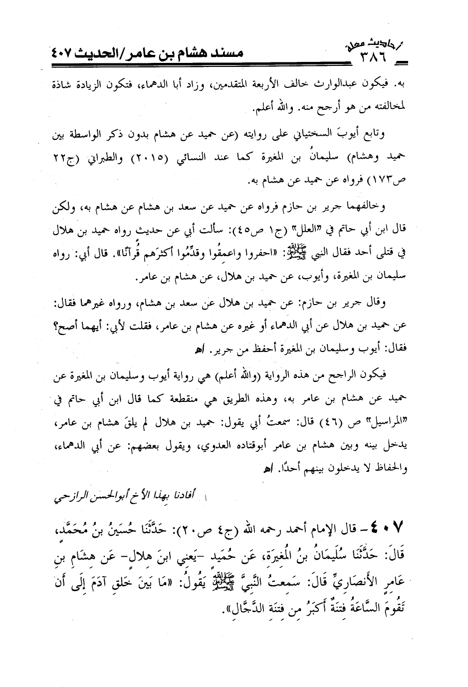 فيكون الراجح من هذه الرواية (والله أعلم) هي رواية أيوب وسليمان بن المغيرة عن حميد عن هشام بن عامر به، وهذه الطريق هي منقطعة كما قال ابن أبي حاتم في "المراسيل" (ص46) سمعت أبي يقول حميد بن هلال لم يلق هشام بن عامر يدخل بينه وبين هشام أبو قتادة العدوي ويقول بعضهم عن أبي الدهماء والحفاظ لا يدخلون بينهم أحداً. اهـ