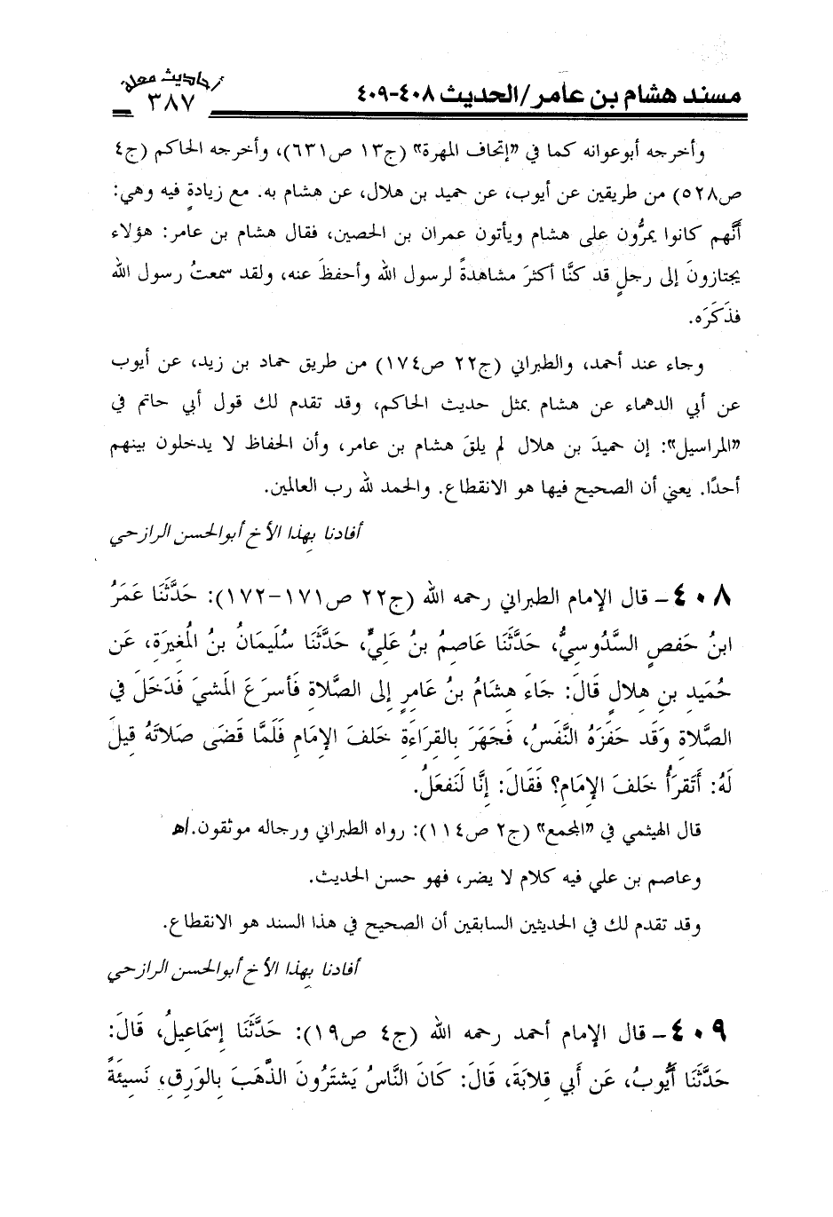وجاءعنداحمد، والطبراني (ج22ص174 (منطريق حماد بن زيد، عن ايوب عن ابي الدرهماء عن هشام بمثل حديث الحاكم، وقد تقدم لك قول ابي حاتم في "المرسيل": ان حميد بن هلال لم يلق هشام بن عامر، وان الحفاظ لايدخلون بينهم احدا. ان يعني ان الصحيح فيها هوالا نقطاع. والحمدالله رب العالمين.