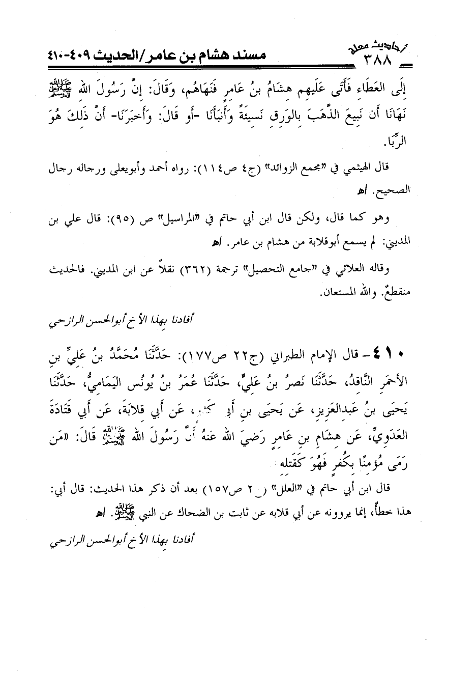 410- قال الإمام الطبراني رحمه الله (ج22ص177) : حدثنا محمد بن علي بن الأحمر الناقد ثنا نصر بن علي ثنا عمر بن يونس اليمامي ثنا يحيى بن عبد العزيز عن يحيى بن أبي كثير عن أبي قلابة عن أبي قتادة العدوي عن هشام بن عامر رضي الله عنه: أن رسول الله صَلَّى اللَّهُ عَلَيْهِ وَعَلَىَ آلِهِ وَسَلَّمَ قال: (من رمى مؤمناً بكفر فهو كقتله)