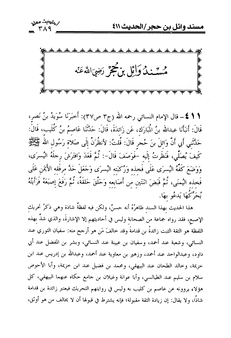 هذاالحديث بهذاالسندظاهره انه حسن، ولكن فيه لفظة شاذةوهي ذكر تحريك الاصبع، فقدرواه جماعة من الصحابة وليس في احاديثهم الا الاشارة، والذي شذبهذه اللفظة هوالثقة الثبت زائدة بن قدامة وقد خالف من هو ارجع منه: سفيان الثوري عند النسائي، وشعبةعند احمد، وسفيان بن عيينةعند النسائي، وبشربن المفضل عند ابي داود، وعبد الواحدوعنداحمد، وزهيربن معاوية عند احمد، وعبد الله بن ادريس عندابن خزيمة، وخالدالطحان عند البيهقي، ومحمد بن فضيل عندابن خزيمة، واباالاحوص سلام بن سليم عند الطيالسي، واباعوانة وغيلان بن جامع حكاه عنهما البيهقي، كل هؤلاءيروونه عن عاصم بن كليب به وليس في روايتهم التحريك فيعتبر زائدة بن قدامة شاذا، ولايقال: إن زيادة الثقة مقبولة، فانه يشترط في قبولها أن لايخالف من هو أوثق،
