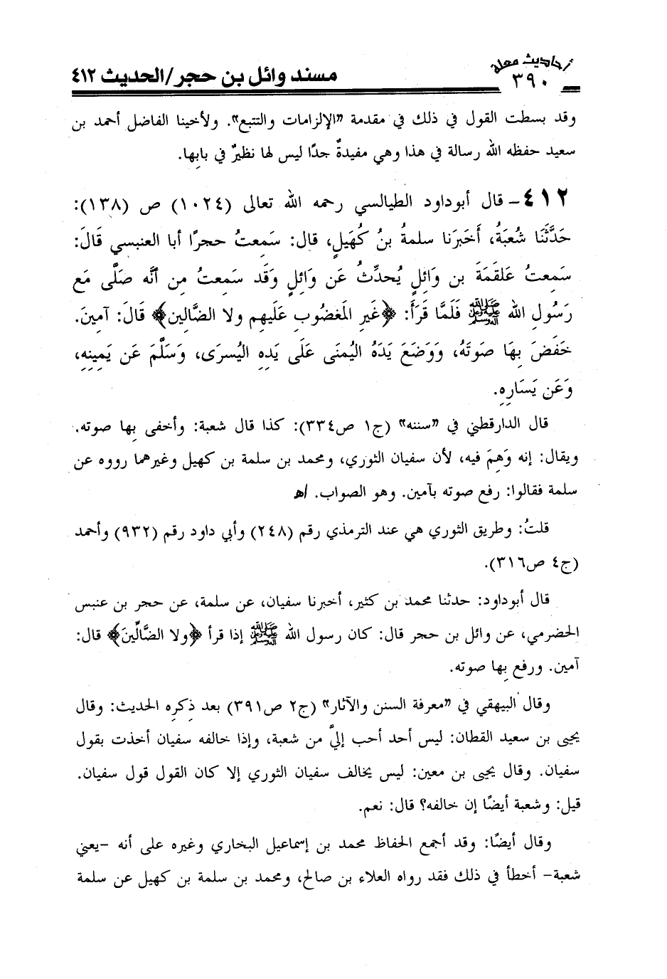 412- قال أبو داود الطيالسي رحمه الله تعالى (1024) ص (138) : حدثنا شعبة قال أخبرني سلمة بن كهيل قال سمعت حجرا أبا العنبس قال سمعت علقمة بن وائل يحدث عن وائل وقد سمعت من وائل انه: صلى مع رسول الله صَلَّى اللَّهُ عَلَيْهِ وَعَلَىَ آلِهِ وَسَلَّمَ فلما قرأ {غير المغضوب عليهم ولا الضالين} قال آمين خفض بها صوته ووضع يده اليمنى على يده اليسرى وسلم عن يمينه وعن يساره) .