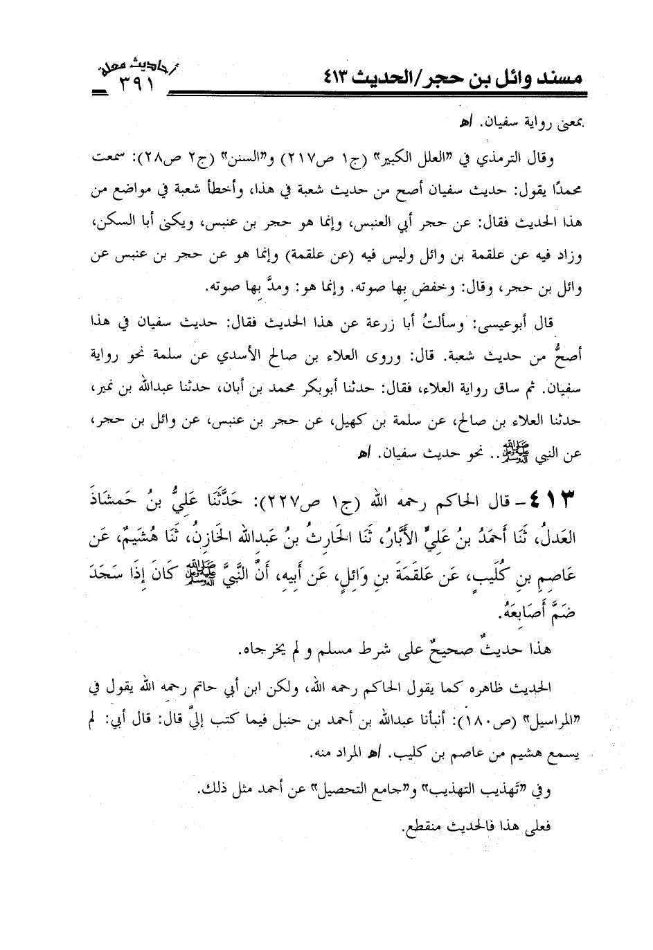 413- قال الإمام الحاكم رحمه الله (ج1ص227) : حدثنا علي بن حمشاذ العدل ثنا أحمد بن علي الأبار ثنا الحارث بن عبد الله الخازن ثنا هشيم عن عاصم بن كليب عن علقمة بن وائل عن أبيه: أن النبي صَلَّى اللَّهُ عَلَيْهِ وَعَلَىَ آلِهِ وَسَلَّمَ كان إذا سجد ضم أصابعه