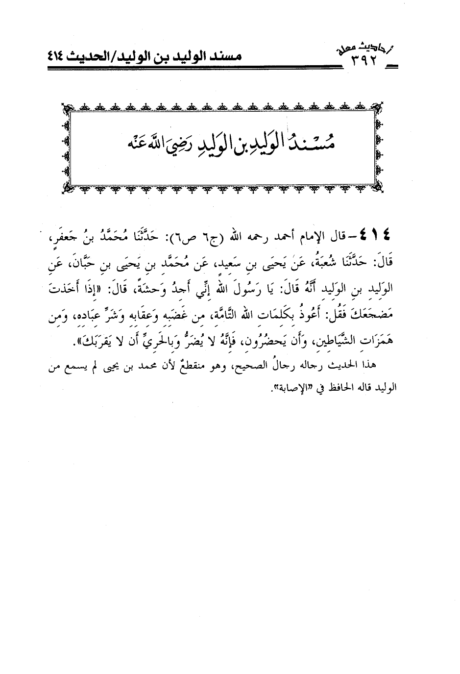 414- قال الإمام أحمد رحمه الله (ج6ص6) : قَالَ حَدَّثَنَا مُحَمَّدُ بْنُ جَعْفَرٍ قَالَ حَدَّثَنَا شُعْبَةُ عَنْ يَحْيَى بْنِ سَعِيدٍ عَنْ مُحَمَّدِ بْنِ يَحْيَى بْنِ حَبَّانَ عَنِ الْوَلِيدِ بْنِ الْوَلِيدِ أَنَّهُ قَالَ يَا رَسُولَ اللَّهِ إِنِّي أَجِدُ وَحْشَةً قَالَ إِذَا أَخَذْتَ مَضْجَعَكَ فَقُلْ أَعُوذُ بِكَلِمَاتِ اللَّهِ التَّامَّةِ مِنْ غَضَبِهِ وَعِقَابِهِ وَشَرِّ عِبَادِهِ وَمِنْ هَمَزَاتِ الشَّيَاطِينِ وَأَنْ يَحْضُرُونِ فَإِنَّهُ لَا يُضَرُّ وَبِالْحَرِيِّ أَنْ لَا يَقْرَبَكَ