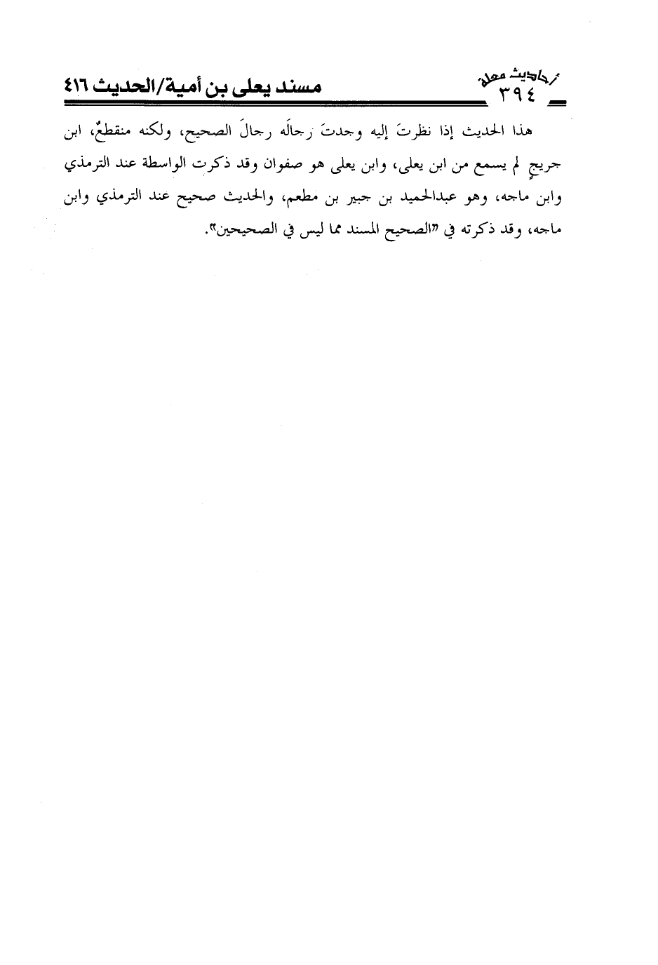 هذا الحديث اذا نظرت اليه رجاله رجال الصحيح، ولكنه منقطع، ابن جريج لم يسمع من يعلى، وابن يعلى هو صفوان وقد ذكرت الواسطة عند الترمذي وابن ماجه، وهو عبد الحميد بن مطعم، والحديث صحيح عند الترمذي وابن ماجه، وقدذكرته في"الصحيح المسند مماليس في الصحيحين".