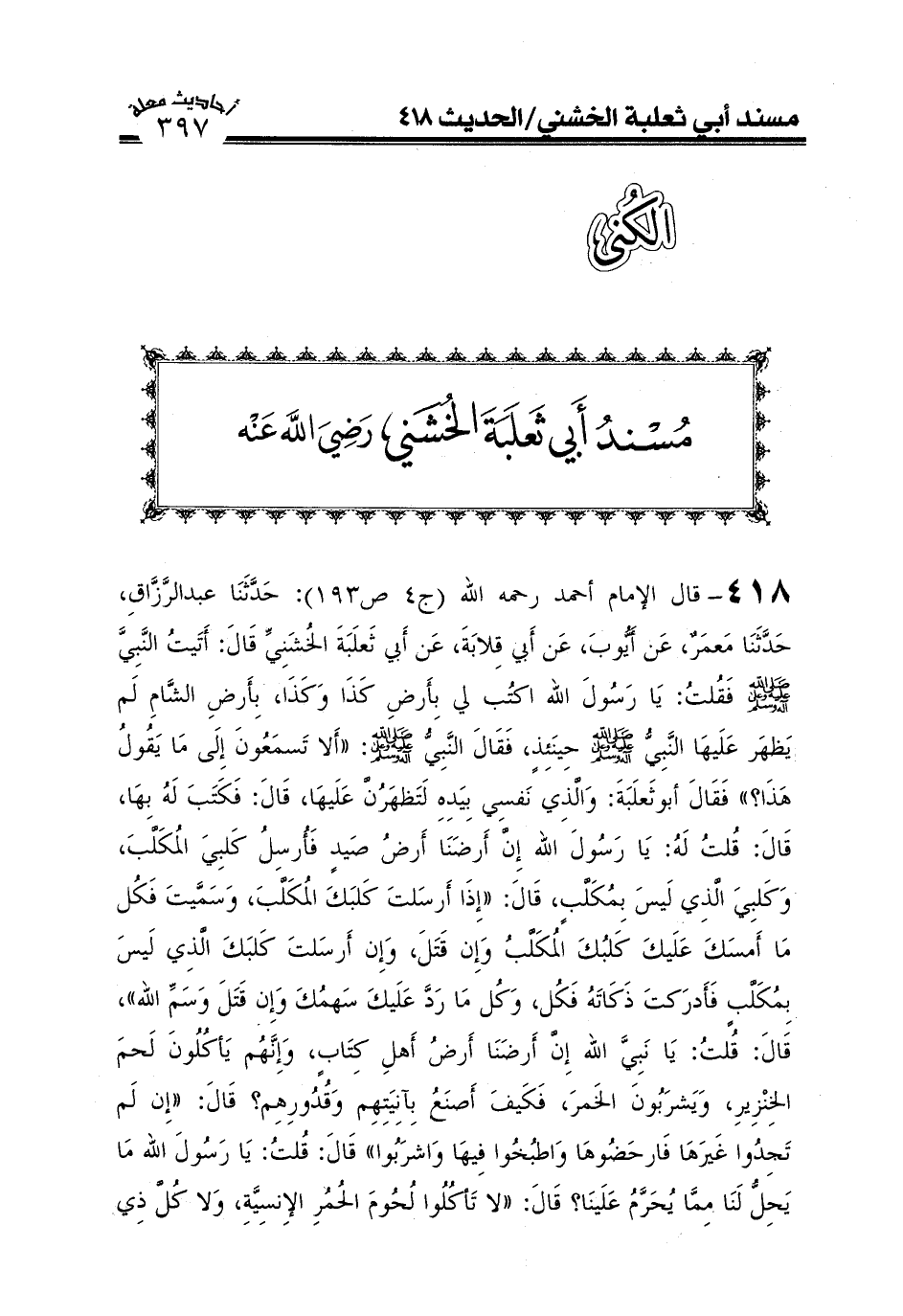 418- قال الإمام أحمد رحمه الله (ج4ص193) : حَدَّثَنَا عَبْدُ الرَّزَّاقِ حَدَّثَنَا مَعْمَرٌ عَنْ أَيُّوبَ عَنْ أَبِي قِلَابَةَ عَنْ أَبِي ثَعْلَبَةَ الْخُشَنِيِّ قَالَ أَتَيْتُ النَّبِيَّ صَلَّى اللَّهُ عَلَيْهِ وَعَلَىَ آلِهِ وَسَلَّمَ فَقُلْتُ يَا رَسُولَ اللَّهِ اكْتُبْ لِي بِأَرْضِ كَذَا وَكَذَا بِأَرْضِ الشَّامِ لَمْ يَظْهَرْ عَلَيْهَا النَّبِيُّ صَلَّى اللَّهُ عَلَيْهِ وَعَلَىَ آلِهِ وَسَلَّمَ حِينَئِذٍ فَقَالَ النَّبِيُّ صَلَّى اللَّهُ عَلَيْهِ وَعَلَىَ آلِهِ وَسَلَّمَ أَلَا تَسْمَعُونَ إِلَى مَا يَقُولُ هَذَا فَقَالَ أَبُو ثَعْلَبَةَ وَالَّذِي نَفْسِي بِيَدِهِ لَتَظْهَرُنَّ عَلَيْهَا قَالَ فَكَتَبَ لَهُ بِهَا قَالَ قُلْتُ لَهُ يَا رَسُولَ اللَّهِ إِنَّ أَرْضَنَا أَرْضُ صَيْدٍ فَأُرْسِلُ كَلْبِيَ الْمُكَلَّبَ وَكَلْبِيَ الَّذِي لَيْسَ بِمُكَلَّبٍ قَالَ إِذَا أَرْسَلْتَ كَلْبَكَ الْمُكَلَّبَ وَسَمَّيْتَ فَكُلْ مَا أَمْسَكَ عَلَيْكَ كَلْبُكَ الْمُكَلَّبُ وَإِنْ قَتَلَ وَإِنْ أَرْسَلْتَ كَلْبَكَ الَّذِي لَيْسَ بِمُكَلَّبٍ فَأَدْرَكْتَ ذَكَاتَهُ فَكُلْ وَكُلْ مَا رَدَّ عَلَيْكَ سَهْمُكَ وَإِنْ قَتَلَ وَسَمِّ اللَّهَ قَالَ قُلْتُ يَا نَبِيَّ اللَّهِ إِنَّ أَرْضَنَا أَرْضُ أَهْلِ كِتَابٍ وَإِنَّهُمْ يَأْكُلُونَ لَحْمَ الْخِنْزِيرِ وَيَشْرَبُونَ الْخَمْرَ فَكَيْفَ أَصْنَعُ بِآنِيَتِهِمْ وَقُدُورِهِمْ قَالَ إِنْ لَمْ تَجِدُوا غَيْرَهَا فَارْحَضُوهَا وَاطْبُخُوا فِيهَا وَاشْرَبُوا قَالَ قُلْتُ يَا رَسُولَ اللَّهِ مَا يَحِلُّ لَنَا مِمَّا يُحَرَّمُ عَلَيْنَا قَالَ لَا تَأْكُلُوا لُحُومَ الْحُمُرِ الْإِنْسِيَّةِ وَلَا كُلَّ ذِي