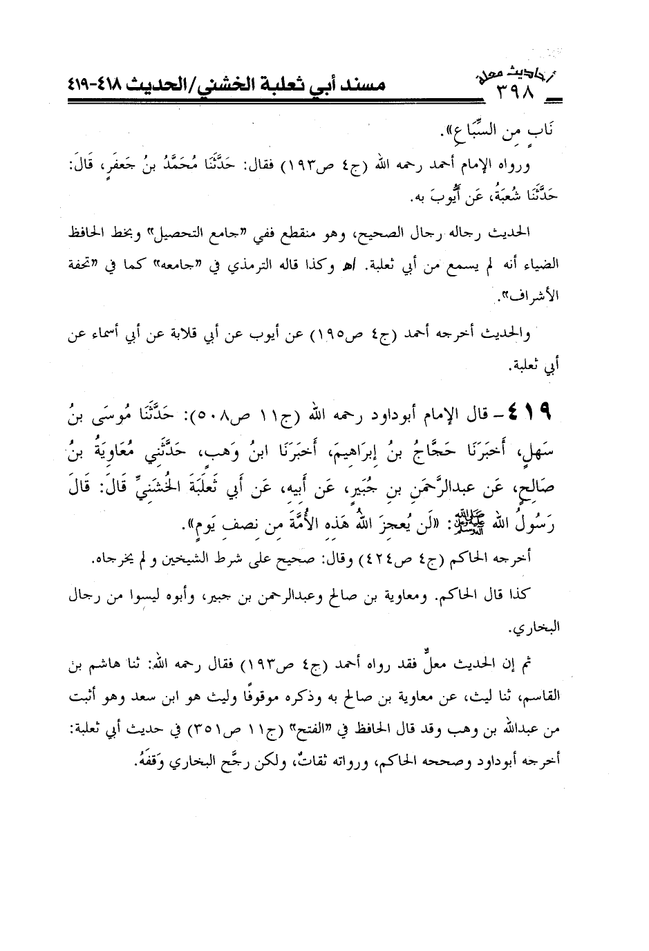 419- قال الإمام أبو داود رحمه الله (ج11ص508) : حدثنا مُوسَى بنُ سَهْلٍ أخبرنا حَجَّاجُ بنُ إِبراهِيمَ أخبرنا ابنُ وَهْبٍ حدَّثني مُعَاوِيَةَ بنُ صَالِحٍ عن عَبْدِ الرَّحْم?نِ بنِ جُبَيْرٍ عن أبِيهِ عن أبي ثَعْلَبَةَ الْخُشَنِيِّ