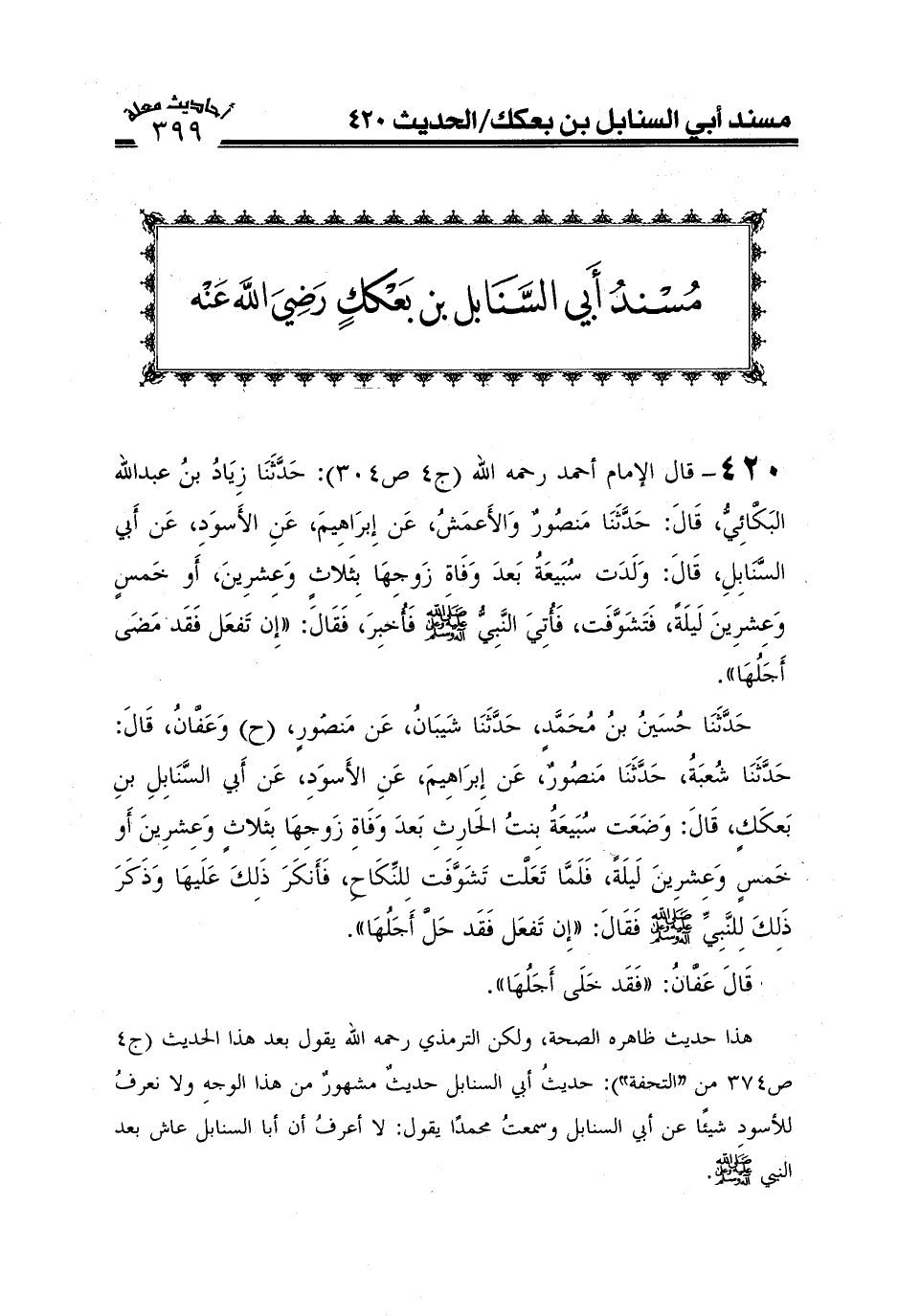 420- قال الإمام أحمد (ج4ص304) حَدَّثَنَا زِيَادُ بْنُ عَبْدِ اللَّهِ الْبَكَّائِيُّ قَالَ حَدَّثَنَا مَنْصُورٌ وَالْأَعْمَشُ عَنْ إِبْرَاهِيمَ عَنِ الْأَسْوَدِ عَنْ أَبِي السَّنَابِلِ قَالَ وَلَدَتْ سُبَيْعَةُ بَعْدَ وَفَاةِ زَوْجِهَا بِثَلَاثٍ وَعِشْرِينَ أَوْ خَمْسٍ وَعِشْرِينَ لَيْلَةً فَتَشَوَّفَتْ فَأُتِيَ النَّبِيُّ صَلَّى اللَّهُ عَلَيْهِ وَعَلَىَ آلِهِ وَسَلَّمَ فَأُخْبِرَ فَقَالَ إِنْ تَفْعَلْ فَقَدْ مَضَى أَجَلُهَا) .