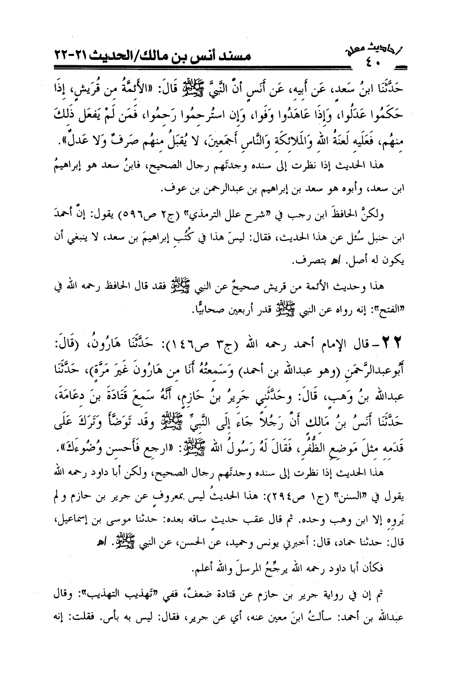 22-قال الإمام أحمد رحمه الله (ج3ص146) : حدَّثَنَا هَارُونُ (قَالَ: أَبُو عَبْد الرَّحْمَنِ (وهو عبد الله بن أحمد) وَسَمِعْتُهُ أَنَا مِنْ هَارُونَ غَيْرَ مَرَّةٍ) حَدَّثَنَا عَبْدُ اللَّهِ بْنُ وَهْبٍ قَالَ حَدَّثَنِي جَرِيرُ بْنُ حَازِمٍ أَنَّهُ سَمِعَ قَتَادَةَ بْنَ دِعَامَةَ حَدَّثَنَا أَنَسُ بْنُ مَالِكٍ: أَنَّ رَجُلًا جَاءَ إِلَى صَلَّى اللَّهُ عَلَيْهِ وَعَلَى آلِهِ وَسَلَّمَ قَدْ تَوَضَّأَ وَتَرَكَ عَلَى قَدَمِهِ مِثْلَ مَوْضِعِ الظُّفُرِ فَقَالَ لَهُ رَسُولُ اللَّهِ صَلَّى اللَّهُ عَلَيْهِ وَعَلَى آلِهِ وَسَلَّمَ: "ارْجِعْ فَأَحْسِنْ وُضُوءَكَ"