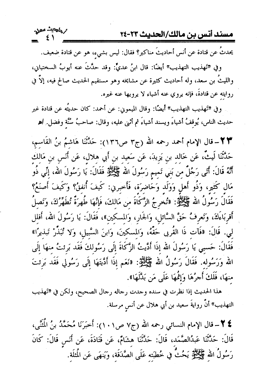 23-قال الإمام أحمد رحمه الله: حَدَّثَنَا هَاشِمُ بْنُ الْقَاسِمِ حَدَّثَنَا لَيْثٌ عَنْ خَالِدِ بْنِ يَزِيدَ عَنْ سَعِيدِ بْنِ أَبِي هِلَالٍ عَنْ أَنَسِ بْنِ مَالِكٍ أَنَّهُ قَالَ: أَتَى رَجُلٌ مِنْ بَنِي تَمِيمٍ رَسُولَ اللَّهِ صَلَّى اللَّهُ عَلَيْهِ وَعَلَى آلِهِ وَسَلَّمَ فَقَالَ يَا رَسُولَ اللَّهِ إِنِّي ذُو مَالٍ كَثِيرٍ وَذُو أَهْلٍ وَوَلَدٍ وَحَاضِرَةٍ فَأَخْبِرْنِي كَيْفَ أُنْفِقُ وَكَيْفَ أَصْنَعُ فَقَالَ رَسُولُ اللَّهِ صَلَّى اللَّهُ عَلَيْهِ وَعَلَى آلِهِ وَسَلَّمَ " تُخْرِجُ الزَّكَاةَ مِنْ مَالِكَ فَإِنَّهَا طُهْرَةٌ تُطَهِّرُكَ وَتَصِلُ أَقْرِبَاءَكَ وَتَعْرِفُ حَقَّ السَّائِلِ وَالْجَارِ وَالْمِسْكِينِ" فَقَالَ يَا رَسُولَ اللَّهِ أَقْلِلْ لِي قَالَ فَآتِ ذَا الْقُرْبَى حَقَّهُ وَالْمِسْكِينَ وَابْنَ السَّبِيلِ وَلَا تُبَذِّرْ تَبْذِيرًا فَقَالَ حَسْبِي يَا رَسُولَ اللَّهِ إِذَا أَدَّيْتُ الزَّكَاةَ إِلَى رَسُولِكَ فَقَدْ بَرِئْتُ مِنْهَا إِلَى اللَّهِ وَرَسُولِهِ فَقَالَ رَسُولُ اللَّهِ صَلَّى اللَّهُ عَلَيْهِ وَعَلَى آلِهِ وَسَلَّمَ نَعَمْ إِذَا أَدَّيْتَهَا إِلَى رَسُولِي فَقَدْ بَرِئْتَ مِنْهَا فَلَكَ أَجْرُهَا وَإِثْمُهَا عَلَى مَنْ بَدَّلَهَا.