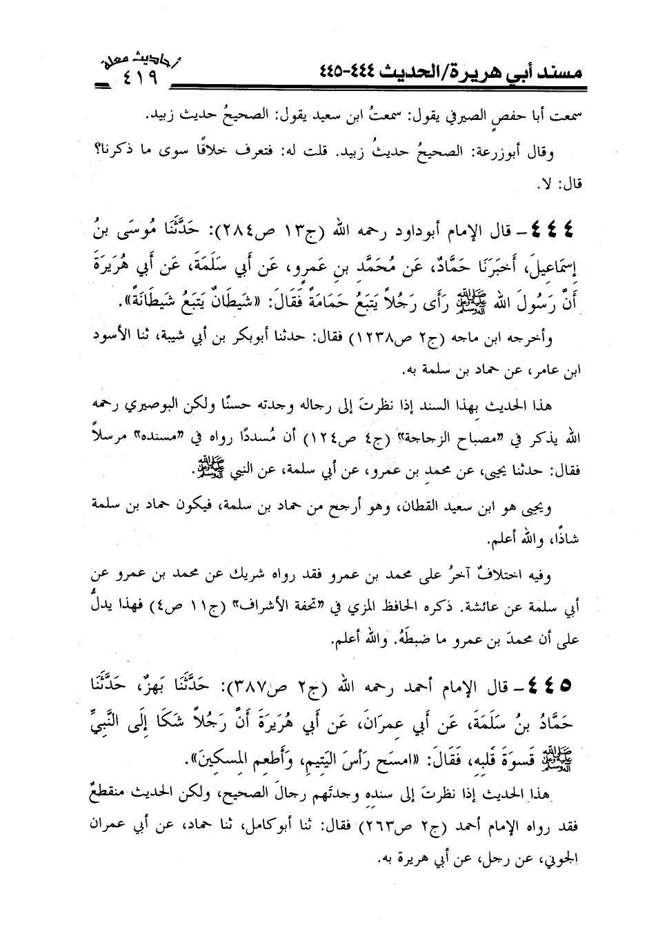 444- قال الإمام أبو داود رحمه الله (ج13ص284) : حدثنا مُوسَى بنُ إسْمَاعِيلَ أخبرنا حَمَّادٌ عن مُحَمَّد بن عَمْرٍو عن أَبِي سَلَمَةَ عن أَبِي هُرَيْرَةَ: " أَنَّ رَسُولَ الله صَلَّى اللَّهُ عَلَيْهِ وَعَلَىَ آلِهِ وَسَلَّمَ رَأَى رَجُلاً يَتْبَعُ حَمَامَةً فقَالَ: " شَيْطَانٌ يَتْبَعُ شَيْطَانَةً".