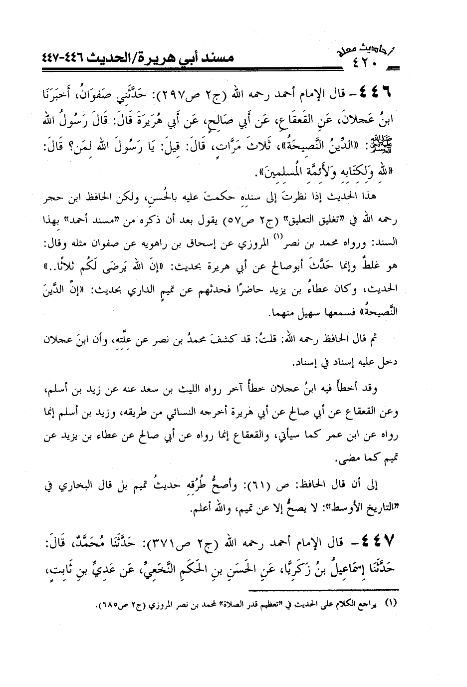 447- قال الإمام أحمد رحمه الله (ج2ص371) : حَدَّثَنَا مُحَمَّدٌ قَالَ حَدَّثَنَا إِسْمَاعِيلُ بْنُ زَكَرِيَّا عَنِ الْحَسَنِ بْنِ الْحَكَمِ النَّخَعِيِّ عَنْ عَدِيِّ بْنِ ثَابِتٍ