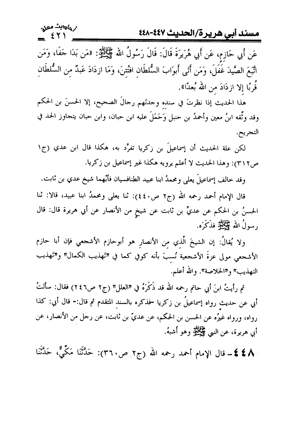 قال الإمام أحمد رحمه الله (ج2ص440) : حدثنا يعلى ومحمد ابنا عبيد قالا حدثنا الحسن بن الحكم عن عدي بن ثابت عن شيخ من الأنصار عن أبي هريرة قال قال رسول الله صَلَّى اللَّهُ عَلَيْهِ وعلى آله وَسَلَّمَ فذكره.