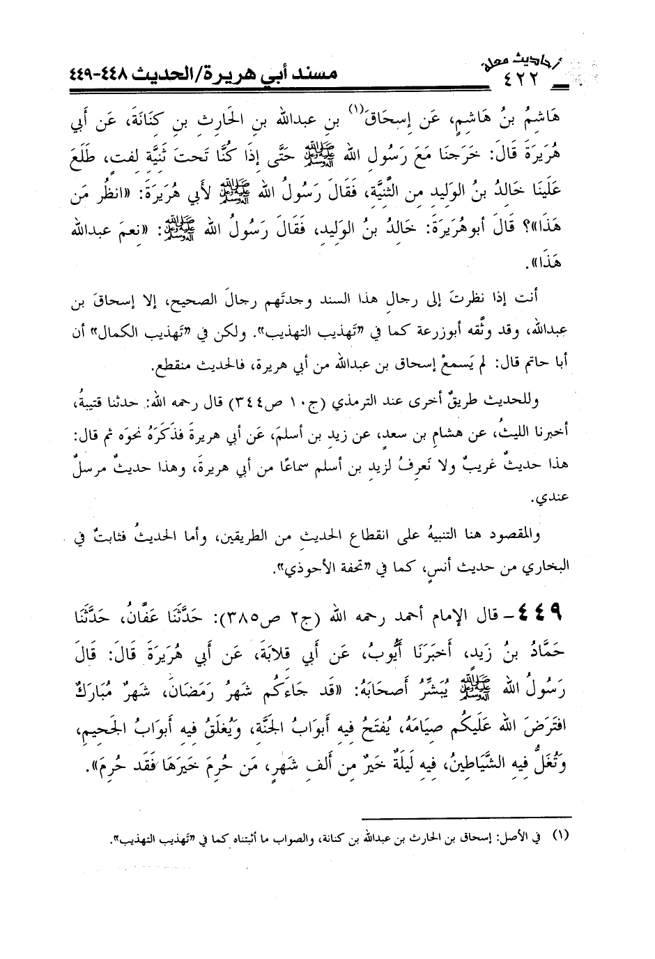 449- قال الإمام أحمد رحمه الله (ج2ص385) : حَدَّثَنَا عَفَّانُ حَدَّثَنَا حَمَّادُ بْنُ زَيْدٍ أَخْبَرَنَا أَيُّوبُ عَنْ أَبِي قِلَابَةَ عَنْ أَبِي هُرَيْرَةَ قَالَ قَالَ رَسُولُ اللَّهِ صَلَّى اللَّهُ عَلَيْهِ وَعَلَىَ آلِهِ وَسَلَّمَ يُبَشِّرُ أَصْحَابَهُ قَدْ جَاءَكُمْ شَهْرُ رَمَضَانَ شَهْرٌ مُبَارَكٌ افْتَرَضَ اللَّهُ عَلَيْكُمْ صِيَامَهُ يُفْتَحُ فِيهِ أَبْوَابُ الْجَنَّةِ وَيُغْلَقُ فِيهِ أَبْوَابُ الْجَحِيمِ وَتُغَلُّ فِيهِ الشَّيَاطِينُ فِيهِ لَيْلَةٌ خَيْرٌ مِنْ أَلْفِ شَهْرٍ مَنْ حُرِمَ خَيْرَهَا فَقَدْ حُرِمَ) .
