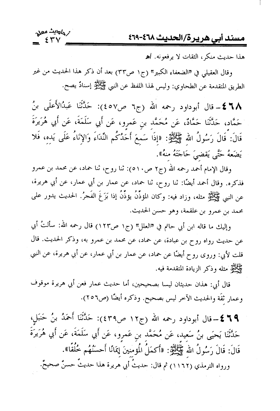 468- قال الإمام أبو داود رحمه الله (ج6ص457) : حدثنا عَبْدُ الأَعْلَى بنُ حَمَّادٍ أخبرنا حَمَّادٌ عن مُحمَّدِ بن عَمْرٍو عنْ أبي سَلَمَةَ عن أَبي هُرَيْرَةَ، قال قال رَسُولُ الله صَلَّى اللَّهُ عَلَيْهِ وَعَلَىَ آلِهِ وَسَلَّمَ: "إذَا سَمِعَ أحَدُكُمْ النِّدَاءَ وَالإنَاءَ عَلَى يَدِهِ فَلاَ يَضَعْهُ حَتَّى يَقْضِيَ حَاجَتَهُ مِنْهُ".