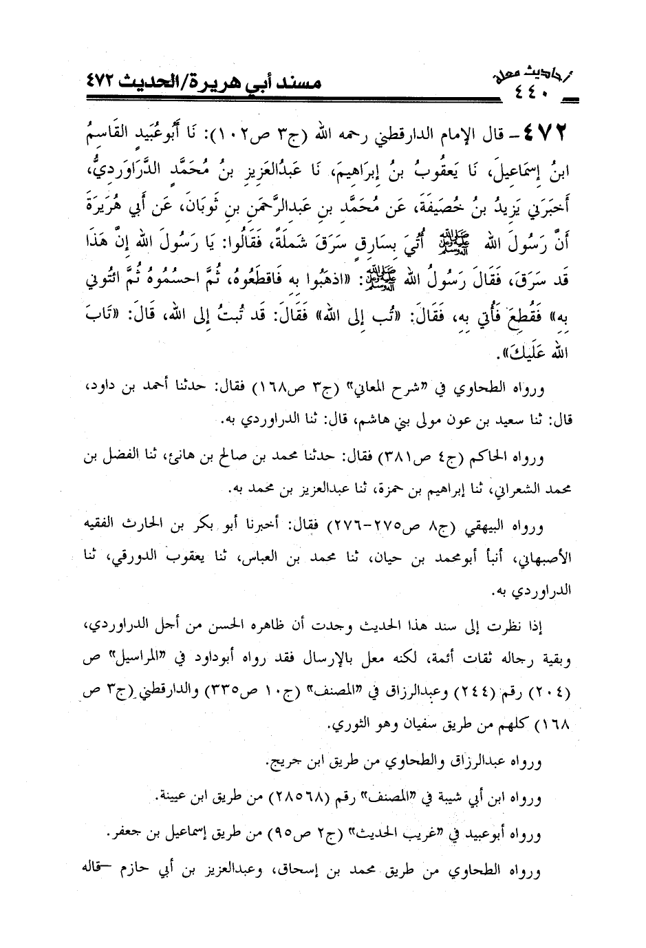 472-قال الإمام الدارقطني رحمه الله (ج3ص102) : نا أبو عبيد القاسم بن إسماعيل نا يعقوب بن إبراهيم نا عبد العزيز بن محمد الدراوردي أخبرني يزيد بن خصيفة عن محمد بن عبد الرحمن بن ثوبان عن أبي هريرة: أن رسول الله صَلَّى اللَّهُ عَلَيْهِ وَعَلَىَ آلِهِ وَسَلَّمَ أتى بسارق سرق شملة فقالوا يا رسول الله إن هذا قد سرق فقال رسول الله صَلَّى اللَّهُ عَلَيْهِ وَعَلَىَ آلِهِ وَسَلَّمَ اذهبوا به فاقطعوه ثم احسموه ثم أئتوني به فقطع فأتي به فقال تب إلى الله فقال قد تبت إلى الله قال تاب الله عليك)