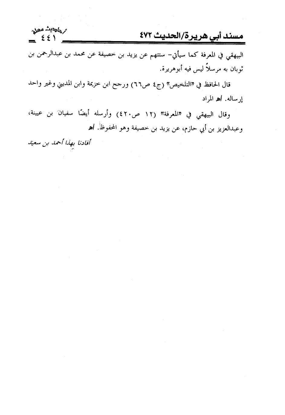 وقال البيهقي في"المعروفة" (12ص420) وأرسله أيضاً سفيان بن عيينة، وعبد العزيز بن أبي حازم، عن يزيد بن خصيفة وهو المحفوظ. اهـ