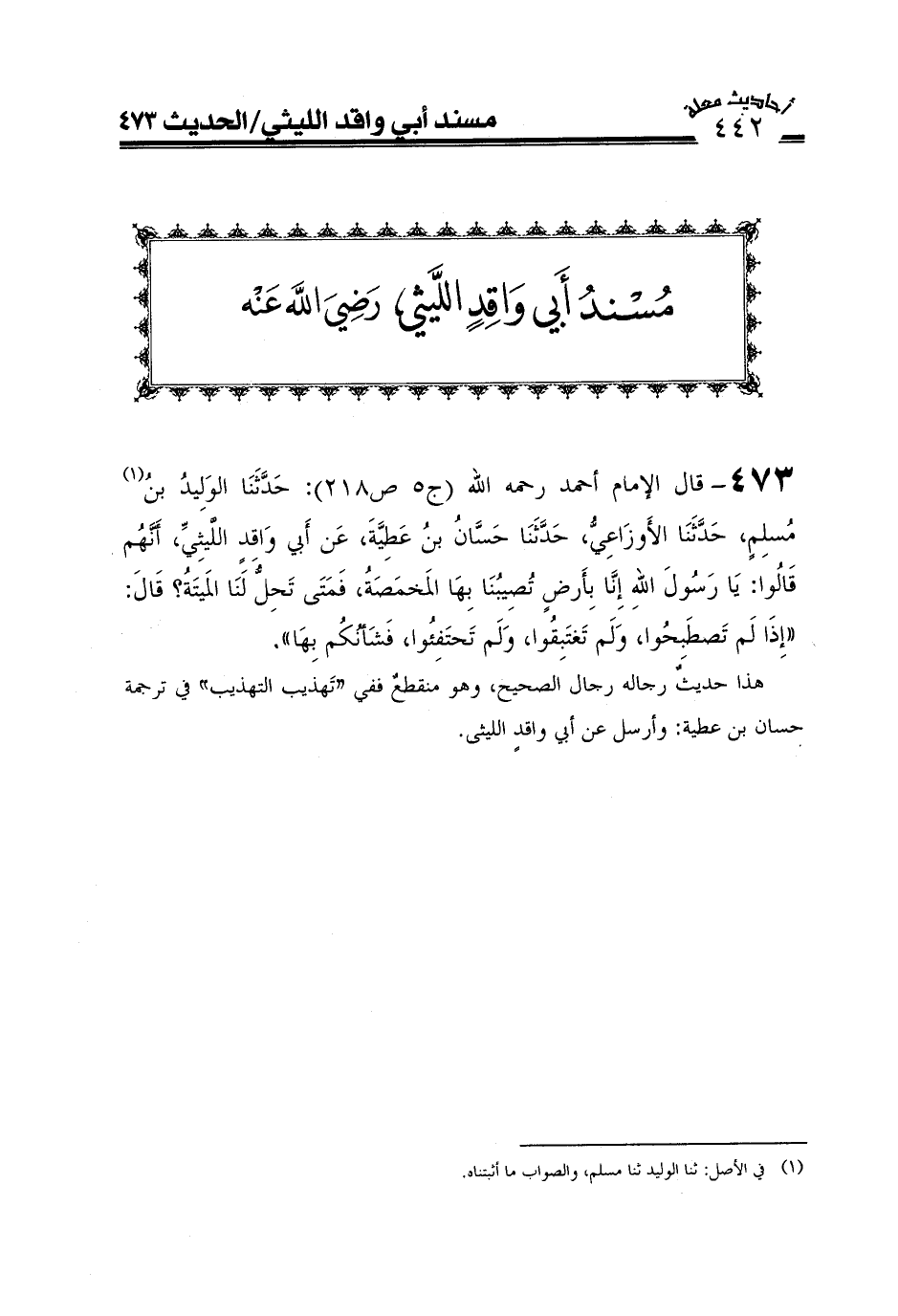 473- قال الإمام أحمد رحمه الله (ج5ص218) : حَدَّثَنَا الْوَلِيدُ بْنُ (¬1) مُسْلِمٌ حَدَّثَنَا الْأَوْزَاعِيُّ حَدَّثَنَا حَسَّانُ بْنُ عَطِيَّةَ عَنْ أَبِي وَاقِدٍ اللَّيْثِيِّ أَنَّهُمْ قَالُوا يَا رَسُولَ اللَّهِ إِنَّا بِأَرْضٍ تُصِيبُنَا بِهَا الْمَخْمَصَةُ فَمَتَى تَحِلُّ لَنَا الْمَيْتَةُ قَالَ إِذَا لَمْ تَصْطَبِحُوا وَلَمْ تَغْتَبِقُوا وَلَمْ تَحْتَفِئُوا فَشَأْنُكُمْ بِهَا