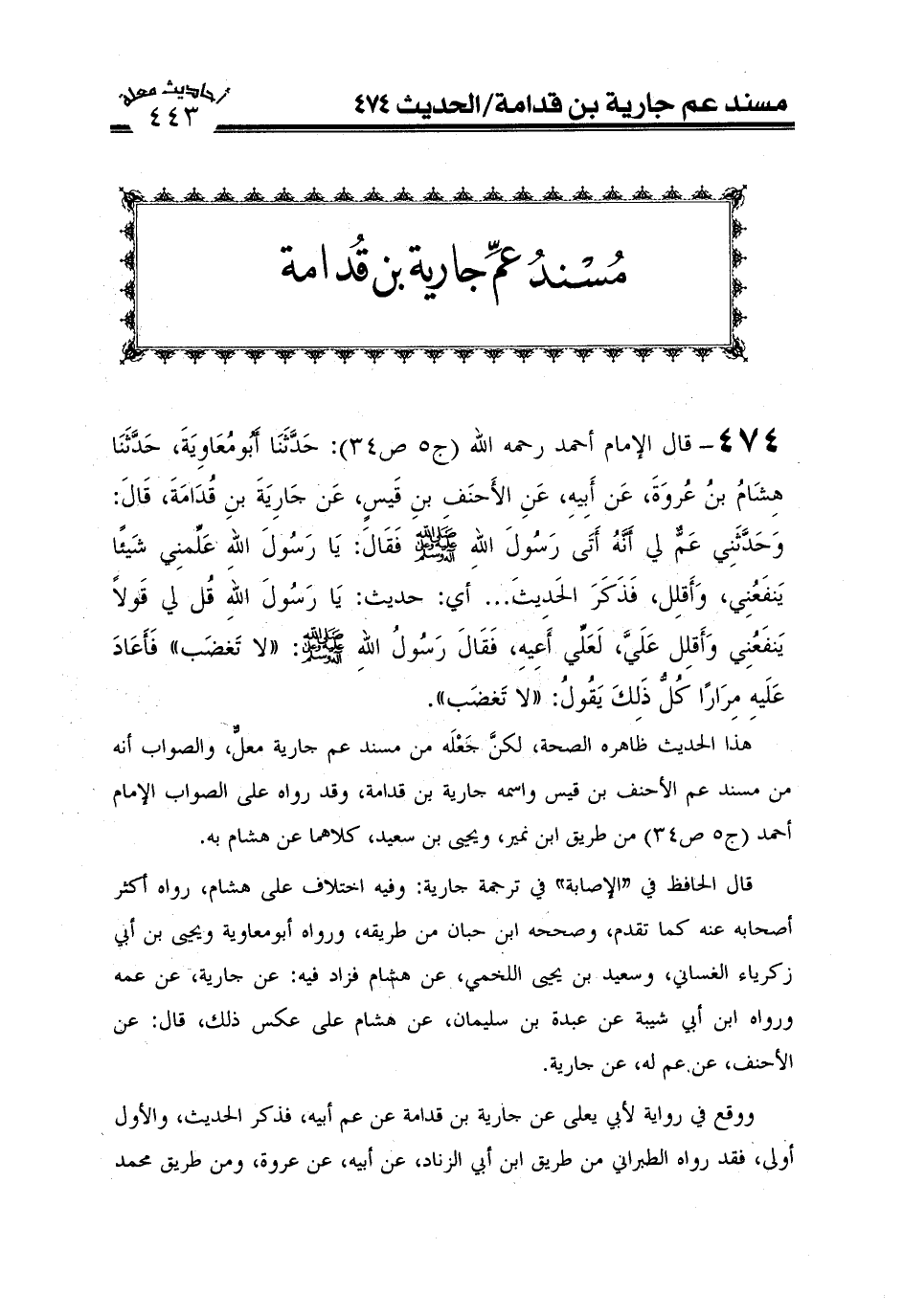 هذا الحديث ظاهره الصحة، ولكن جعله من مسند عم جارية معل، والصواب أنه من مسند عم الأحنف بن قيس واسمه جارية بن قدامة، وقد رواه على الصواب الإمام احمد (ج5ص34) من طريق ابن نمير، ويحيى بن سعيد، كلاهما عن هشام به.