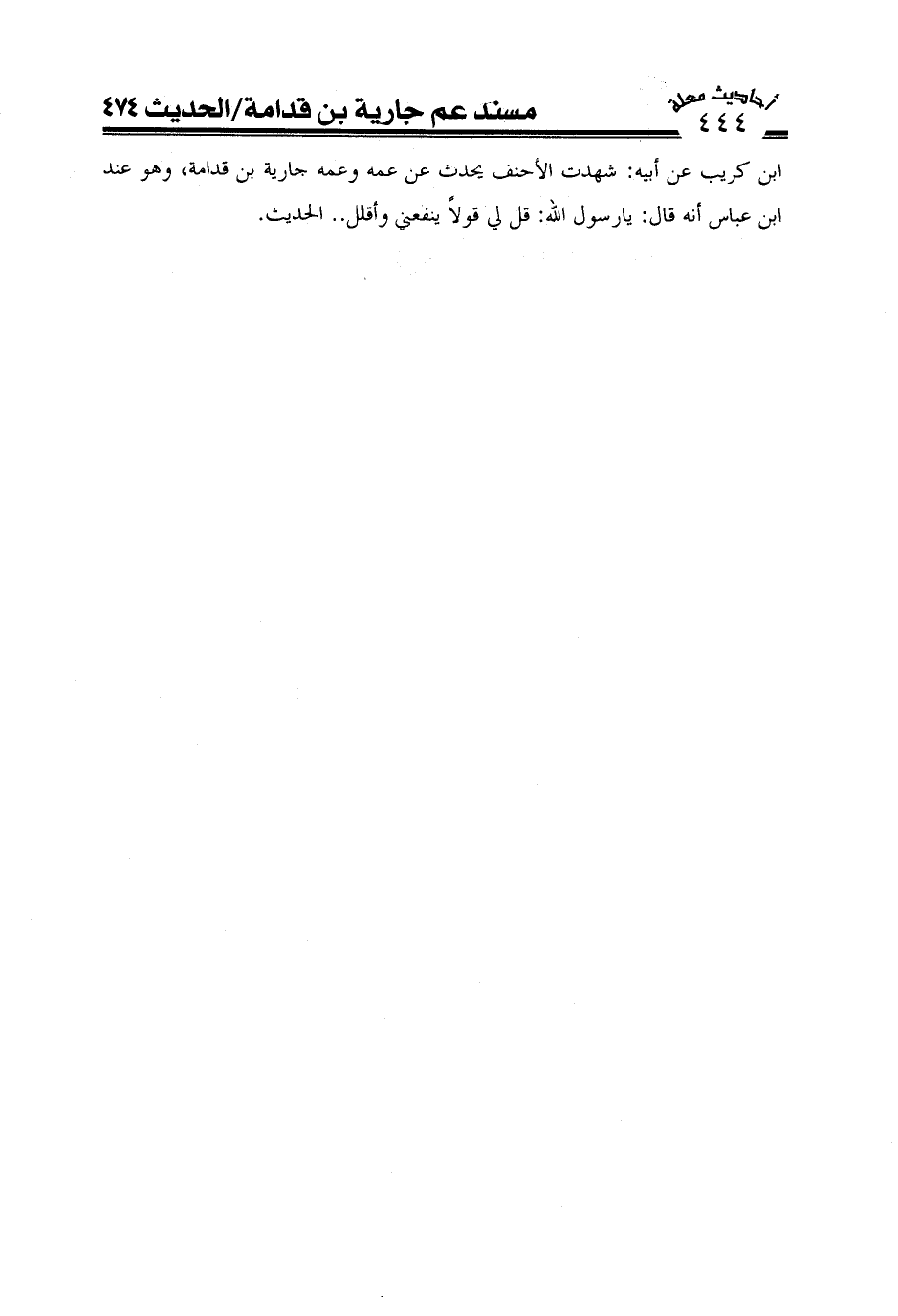 بن كريب عن أبيه شهدت الأحنف يحدث عن عمه جارية وعمه جارية بن قدامة وهو عند بن عباس أنه قال يا رسول الله قل لي قولا ينفعني واقلل ... الحديث.