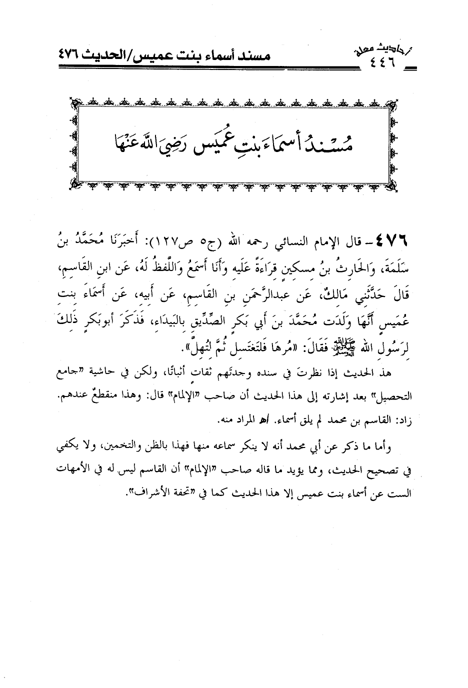 وإما ما ذكر عن أبي محمد انه لا ينكر سماعه منها فهذا بالظن والتخمين، ولا يكفي في تصحيح الحديث، ومما يؤيد ما قاله صاحب"الإلمام"أن القاسم ليس له في الأمهات الست عن أسماء بنت عميس إلا هذا الحديث كما في "تحفة الأشراف".