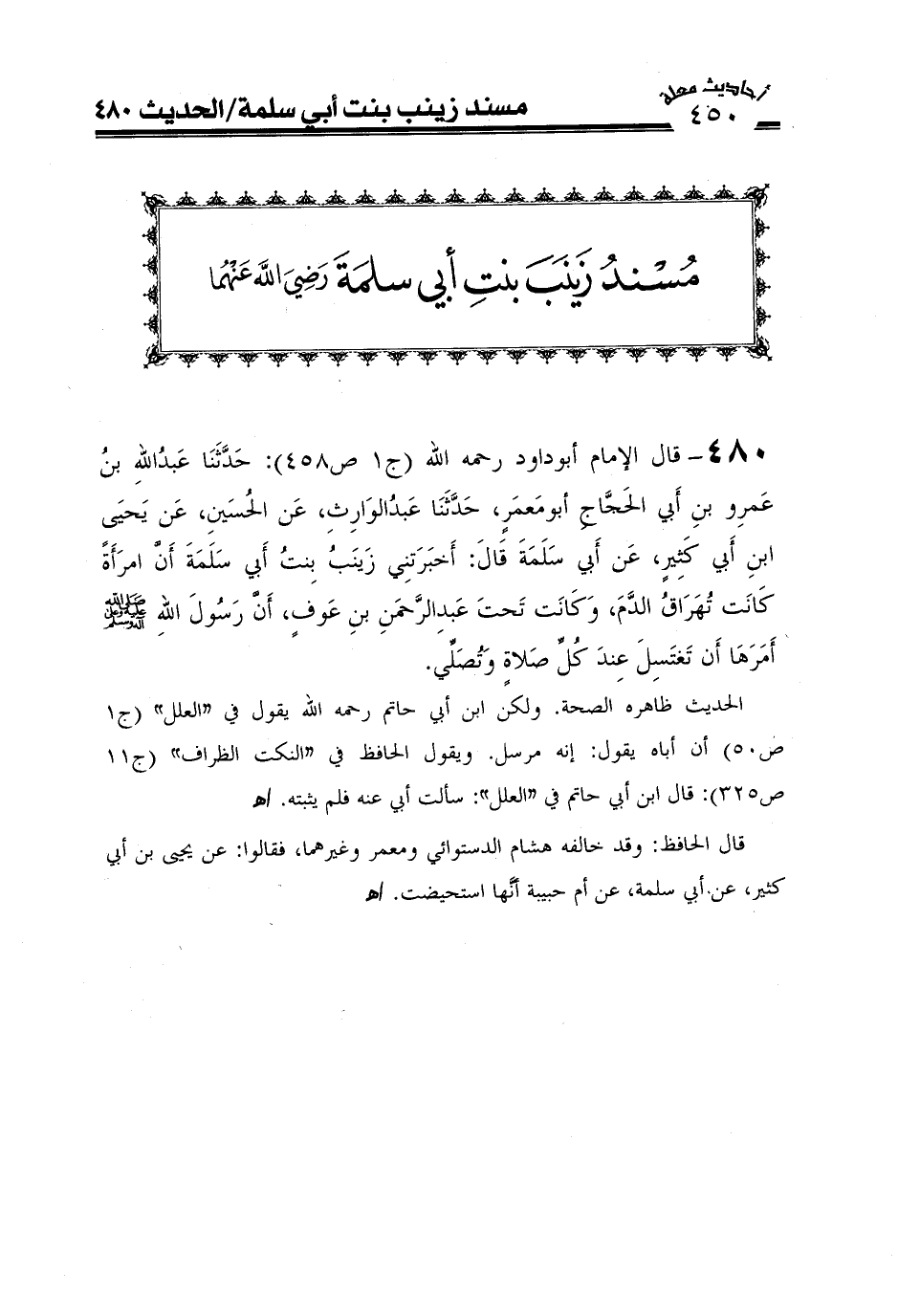 480- قال الإمام أبو داود رحمه الله (ج1ص458) : حدثنا عَبْدُ الله بنُ عَمْرٍو بنِ أبي الحَجَّاجِ أبُو مَعْمَرٍ أخبرنا عَبْدُ الوَارِثِ عن الْحُسَيْنِ عن يَحْيَى بنِ أبي كَثِيرٍ عن أبي سَلَمَةَ، قال "حَدَّثَتْنِي زَيْنَبُ بِنتُ أبي سَلَمَةَ أنَّ امْرَأةً كَانتْ تُهْرَاقُ الدَّمَ وكَانتْ تَحْتَ عَبْدِ الرَّحْمَنِ بنِ عَوْفٍ أنَّ رسولَ الله صَلَّى اللَّهُ عَلَيْهِ وَعَلَىَ آلِهِ وَسَلَّمَ أمَرَهَا أنْ تَغْتَسِلَ عِنْدَ كُلِّ صَلاَةٍ وَتُصَلِّي".