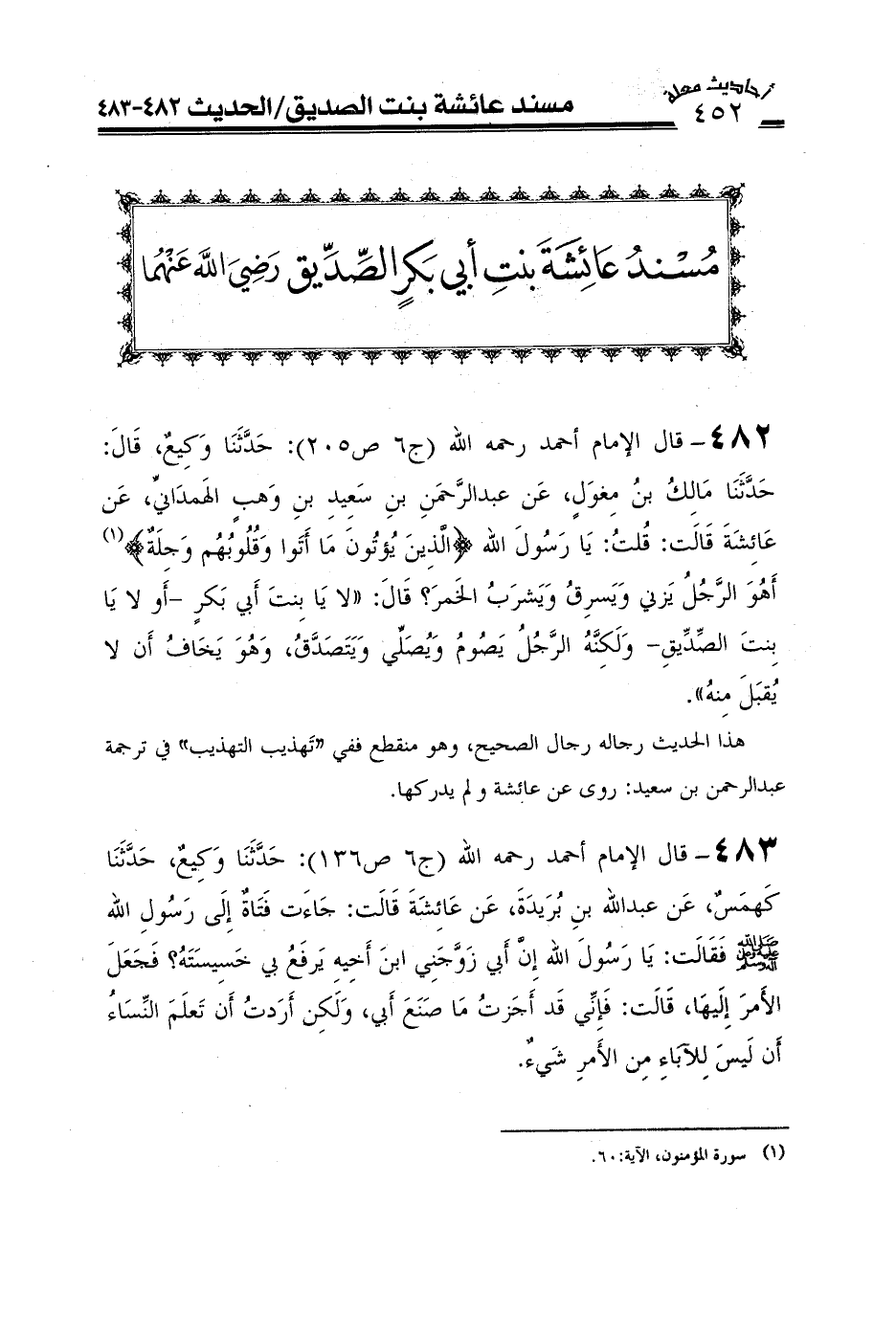 482- قال الإمام أحمد رحمه الله (ج6ص205) : حَدَّثَنَا وَكِيعٌ قَالَ حَدَّثَنَا مَالِكُ بْنُ مِغْوَلٍ عَنْ عَبْدِ الرَّحْمَنِ بْنِ سَعِيدِ بْنِ وَهْبٍ الْهَمْدَانِيِّ عَنْ عَائِشَةَ قَالَتْ قُلْتُ يَا رَسُولَ اللَّهِ {الَّذِينَ يُؤْتُونَ مَا أَتَوْا وَقُلُوبُهُمْ وَجِلَةٌ} أَهُوَ الرَّجُلُ يَزْنِي وَيَسْرِقُ وَيَشْرَبُ الْخَمْرَ قَالَ لَا يَا بِنْتَ أَبِي بَكْرٍ أَوْ لَا يَا بِنْتَ الصِّدِّيقِ وَلَكِنَّهُ الرَّجُلُ يَصُومُ وَيُصَلِّي وَيَتَصَدَّقُ وَهُوَ يَخَافُ أَنْ لَا يُقْبَلَ مِنْهُ) .