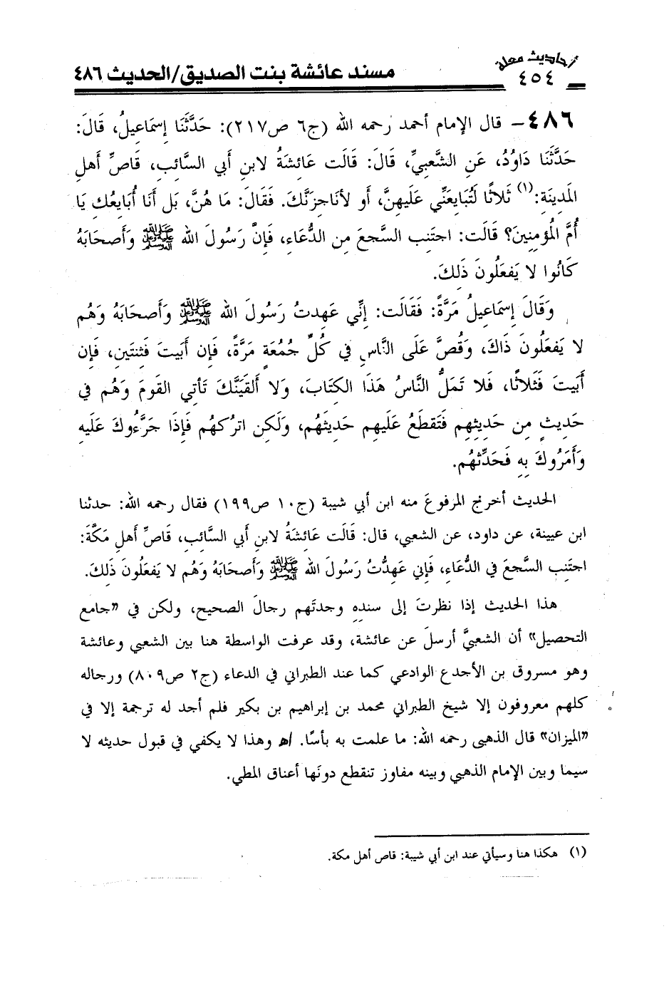 هذا الحديث إذا نظرت إلى سنده وجدتهم رجال الصحيح، ولمن في "جامع التحصيل" أن الشعبي أرسل عن عائشة، وقد عرفت الواسطة هنا بين الشعبي وعائشة وهو مسروق بن الأجدع الوادعي كما عند الطبراني في الدعاء (ج2ص809) ورجاله كلهم معروفون إلا شيخ الطبراني محمد بن إبراهيم بن بكير فلم أجد له ترجمة إلا في "الميزان" قال الذهبي: ما علمت به بأساً. اهـ