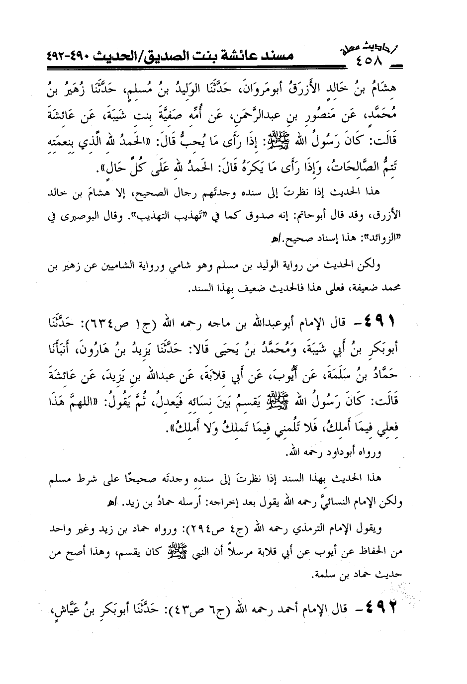 491- قال الإمام أبو عبد الله ابن ماجة رحمه الله (ج2ص634) : حَدَّثَنَا أَبُو بَكْرِ بْنُ أَبِي شَيْبَةَ وَمُحَمَّدُ بْنُ يَحْيَى قَالَا حَدَّثَنَا يَزِيدُ بْنُ هَارُونَ أَنْبَأَنَا حَمَّادُ بْنُ سَلَمَةَ عَنْ أَيُّوبَ عَنْ أَبِي قِلَابَةَ عَنْ عَبْدِ اللَّهِ بْنِ يَزِيدَ عَنْ عَائِشَةَ قَالَتْ: كَانَ رَسُولُ اللَّه صَلَّى اللَّهُ عَلَيْهِ وَعَلَىَ آلِهِ وَسَلَّمَ يَقْسِمُ بَيْنَ نِسَائِهِ فَيَعْدِلُ ثُمَّ يَقُولُ اللَّهُمَّ هَذَا فِعْلِي فِيمَا أَمْلِكُ فَلَا تَلُمْنِي فِيمَا تَمْلِكُ وَلَا أَمْلِكُ) .